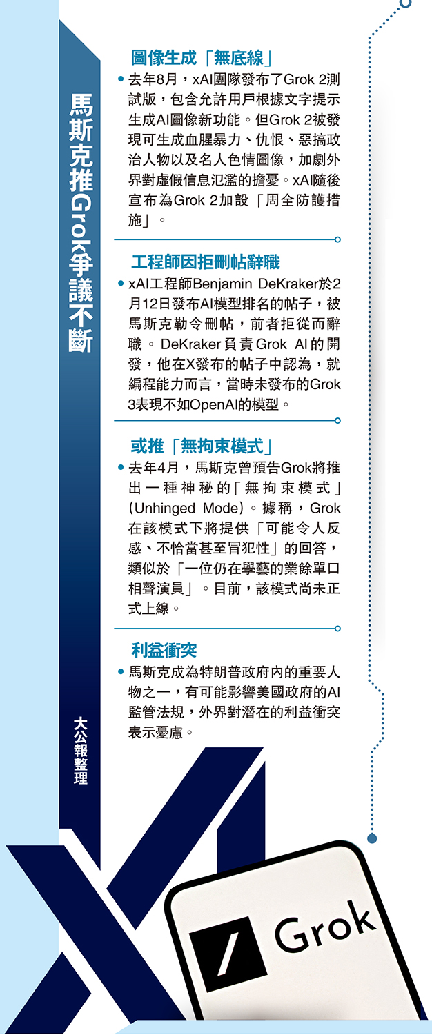 •去年8月,xAI團隊發布了Grok 2測試版,包含允許用戶根據文字提示生成AI圖像新功能。但Grok 2被發現可生成血腥暴力、仇恨、惡搞政治人物以及名人色情圖像,加劇外界對虛假信息氾濫的擔憂。xAI隨後宣布為Grok 2加設「周全防護措施」。