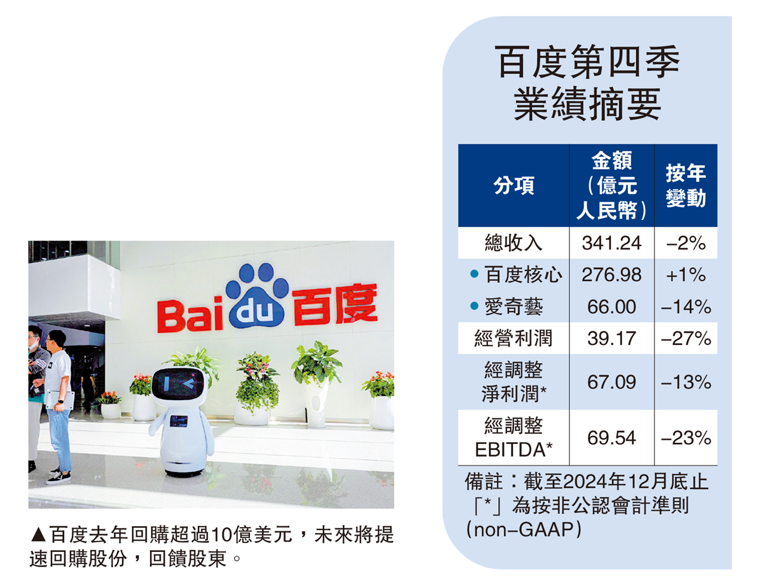 另外,百度上季回購金額為3.56億美元(約27.8億港元),2024年累計回購超過10億美元(約78億港元)。何俊傑表示,未來將提速回購股份,以回饋股東。