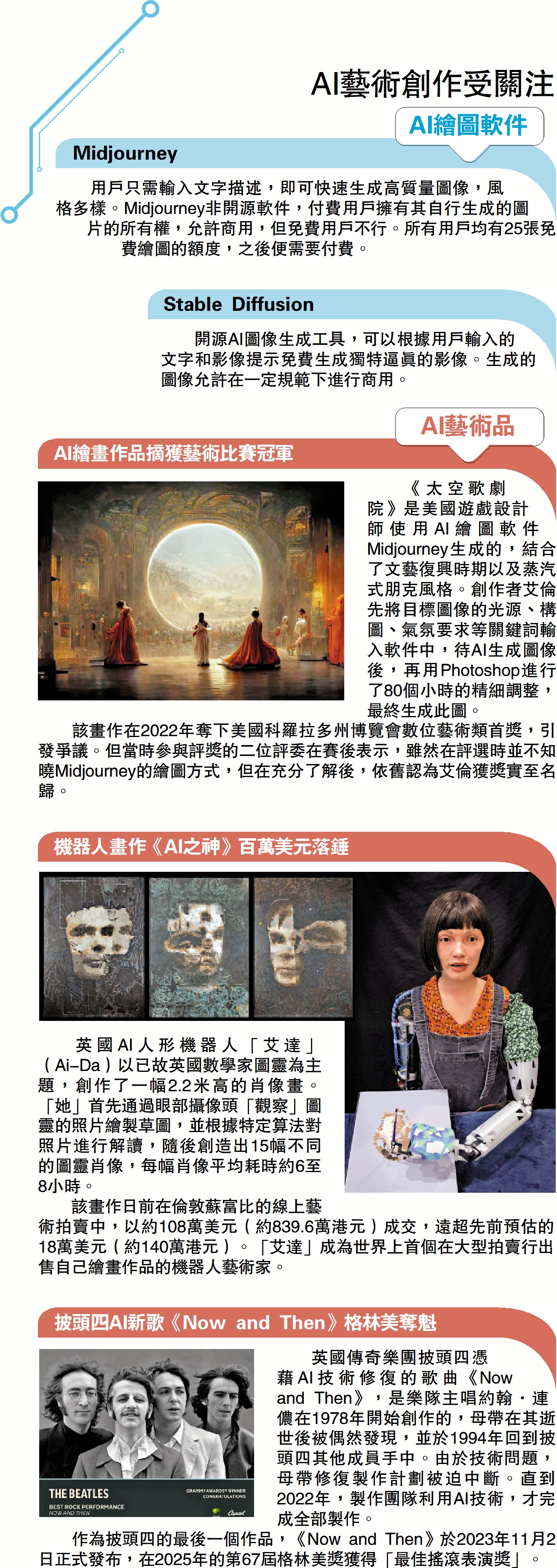 英國傳奇樂團披頭四憑藉AI技術修復的歌曲《Now and Then》,是樂隊主唱約翰·連儂在1978年開始創作的,母帶在其逝世後被偶然發現,並於1994年回到披頭四其他成員手中。由於技術問題,母帶修復製作計劃被迫中斷。直到2022年,製作團隊利用AI技術,才完成全部製作。