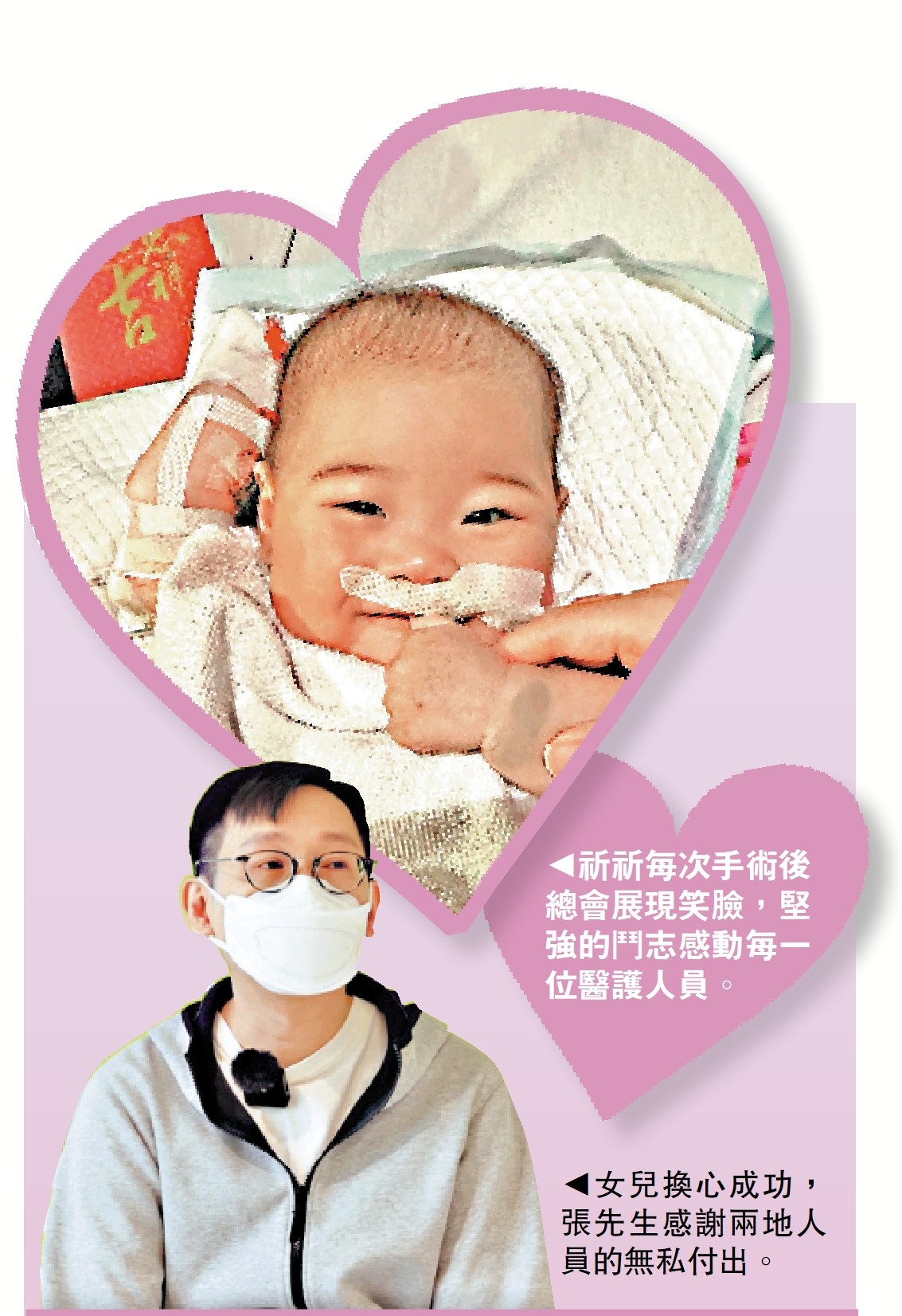 八個月大女嬰祈祈近日成功換心,成為本港第二宗跨境器官捐贈個案。祈祈的主診醫生張耀輝教授昨日接受《大公報》專訪時表示,祈祈由求診、治療到移植,經歷三大挑戰,最終一一克服。祈祈每次過難關,總是掛着笑臉,顯示堅強鬥志,感動每一位醫護人員。