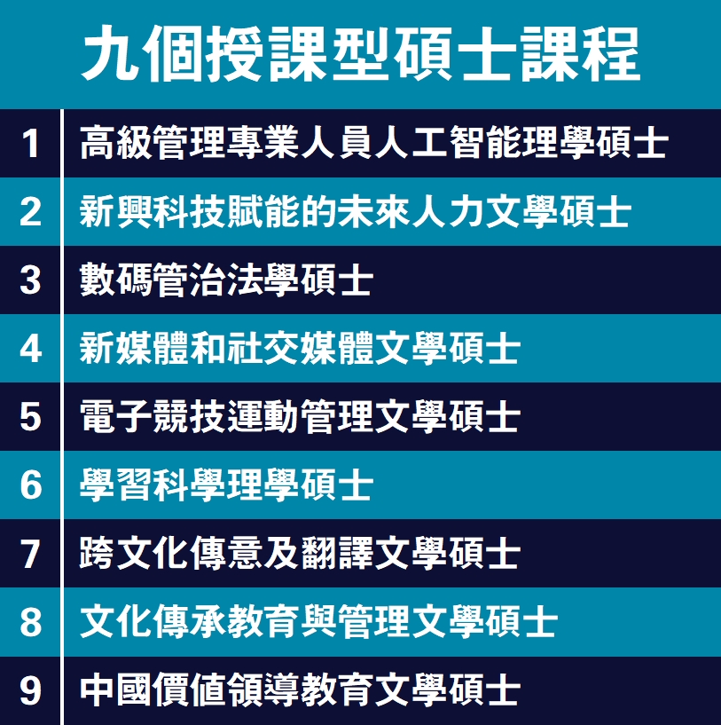為配合科技發展及行業變化,教大將推出9個全新授課型碩士課程,其中5個課程與人工智能和新興科技相關(詳見表)。