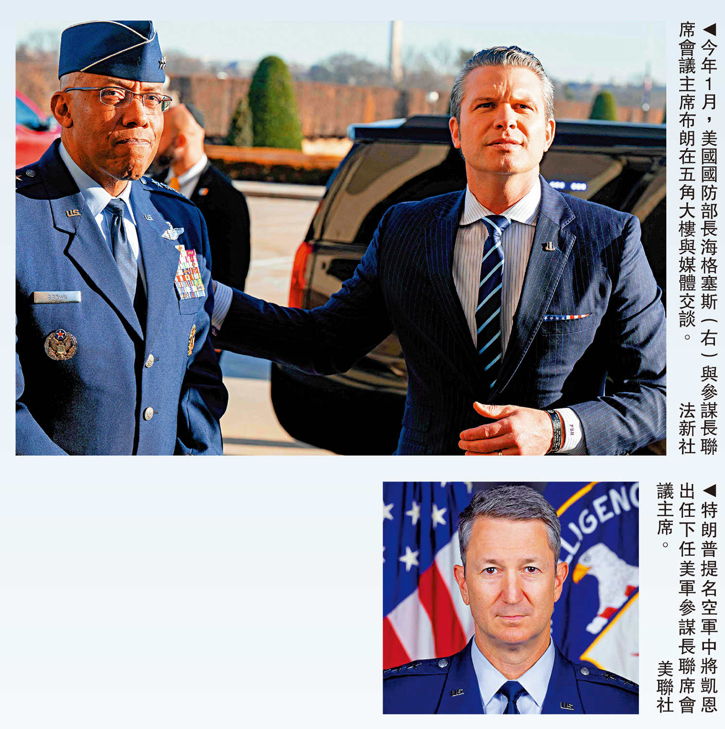 【大公報訊】特朗普21日晚在自家社媒平台「真實社交」上發文布朗被撤職的消息,同時感謝布朗為國服務,同時宣布將提名退休的空軍中將凱恩接替布朗的職位。特朗普宣布這一決定前約兩小時,布朗更新了社交媒體動態,顯示當天他正在美國與墨西哥邊境視察部隊。據國防部官員透露,特朗普發文前,國防部長海格塞斯致電布朗告知他被解職。