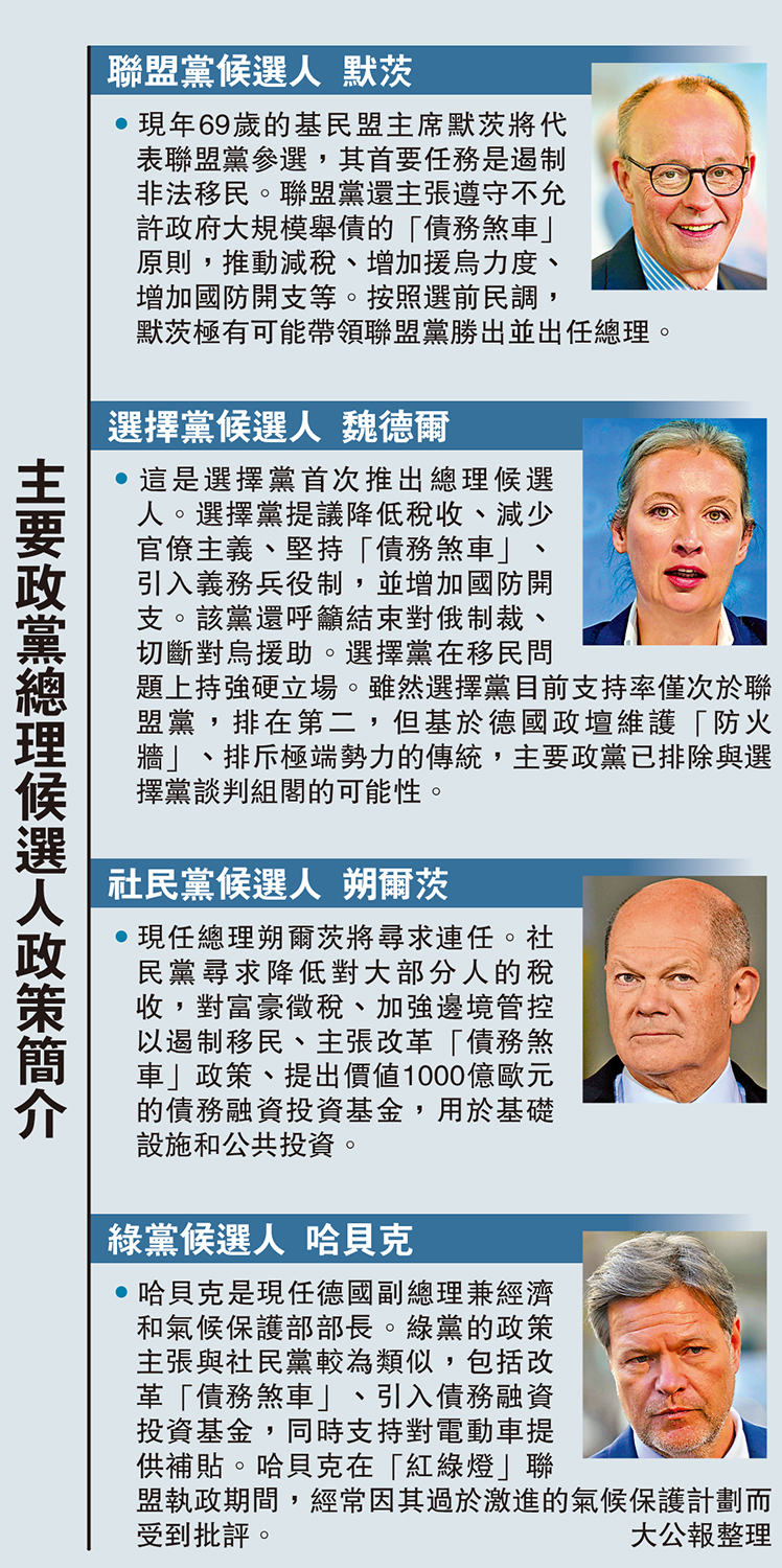•現年69歲的基民盟主席默茨將代表聯盟黨參選,其首要任務是遏制非法移民。聯盟黨還主張遵守不允許政府大規模舉債的「債務煞車」原則,推動減稅、增加援烏力度、增加國防開支等。按照選前民調,默茨極有可能帶領聯盟黨勝出並出任總理。