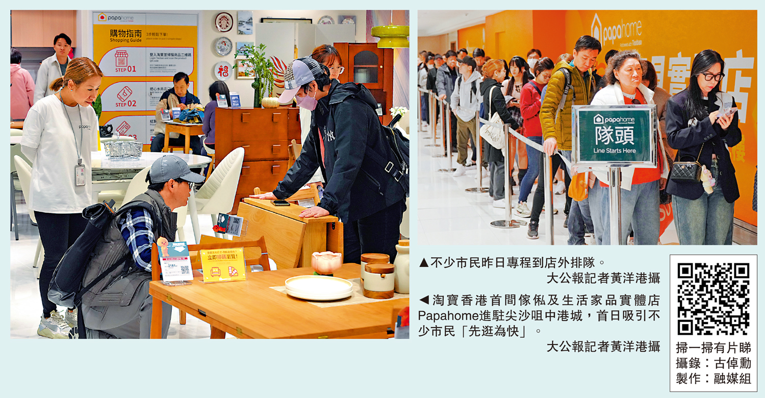【大公報訊】記者古倬勳、李信、劉遠報道:淘寶香港首間傢俬及生活家品實體店Papahome進駐尖沙咀中港城,首日吸引不少市民「先逛為快」。大公報記者昨日到現場觀察,發現全日人龍不絕,市民有的專程前往體驗「從線上到線下」模式,認為實體店令人對貨品更有信心。多位商界人士及學者認為,開設大型實體店的商業行為,在一定程度上反映對香港長遠經濟前景看好。