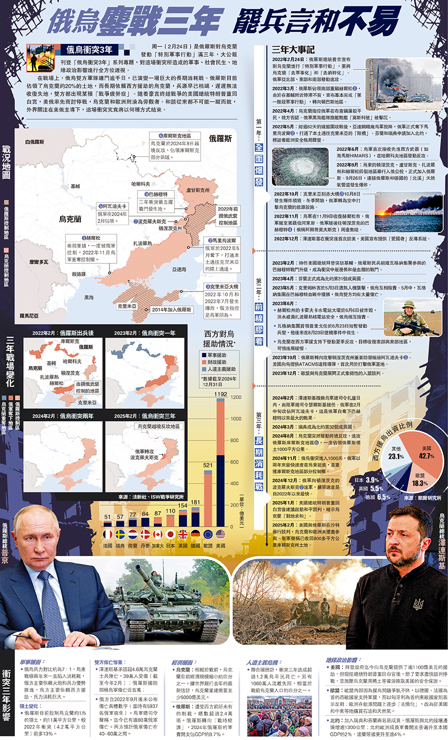 周一(2月24日)是俄羅斯對烏克蘭發動「特別軍事行動」滿三年,大公報刊登「俄烏衝突3年」系列專題,對這場衝突所造成的軍事、社會民生、地緣政治影響進行全方位透視。