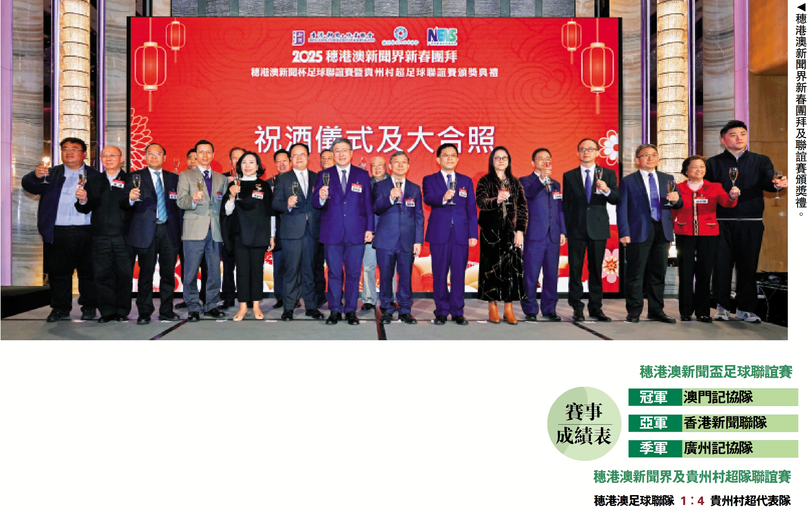 2025穗港澳新聞盃足球聯誼賽暨貴州村超足球聯誼賽於2月23日上午圓滿落幕,澳門新聞工作者協會足球隊、貴州村超代表隊分別奪得穗港澳新聞界足球聯誼賽「新聞盃」冠軍、穗港澳新聞界及貴州村超代表隊聯誼賽冠軍。藉新春佳節之際,同日舉行了2025穗港澳新聞界新春團拜及盛大頒獎典禮。
