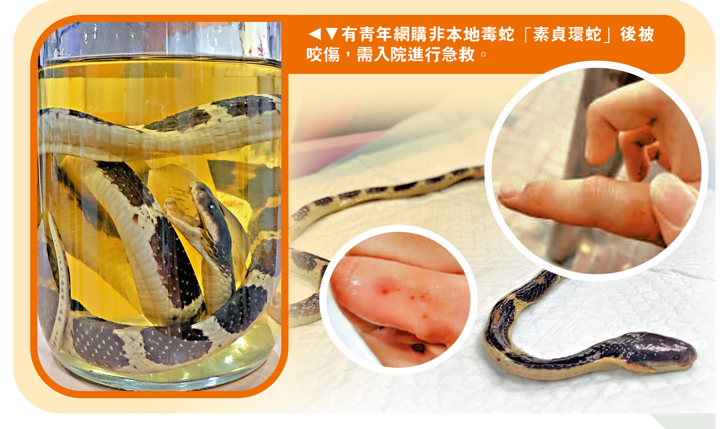 近年透過網上平台或社交媒體購買寵物成為新熱潮,包括網購各類毒蛇等兩棲動物,受到不少異寵迷的歡迎,但實則危機四伏。去年有青年網購內地新品種「素貞環蛇」,被咬中毒後,心臟、肝等多個器官受損,但因本地沒有相應抗毒血清,難以盡快注射解毒,最後經五次全身「洗血」,才得以康復。專家指出,疫後網購動物個案增加,但本港很難找到非本地蛇的針對性血清,呼籲勿從不合法或不明渠道購買寵物飼養。\大公報記者 王亞毛