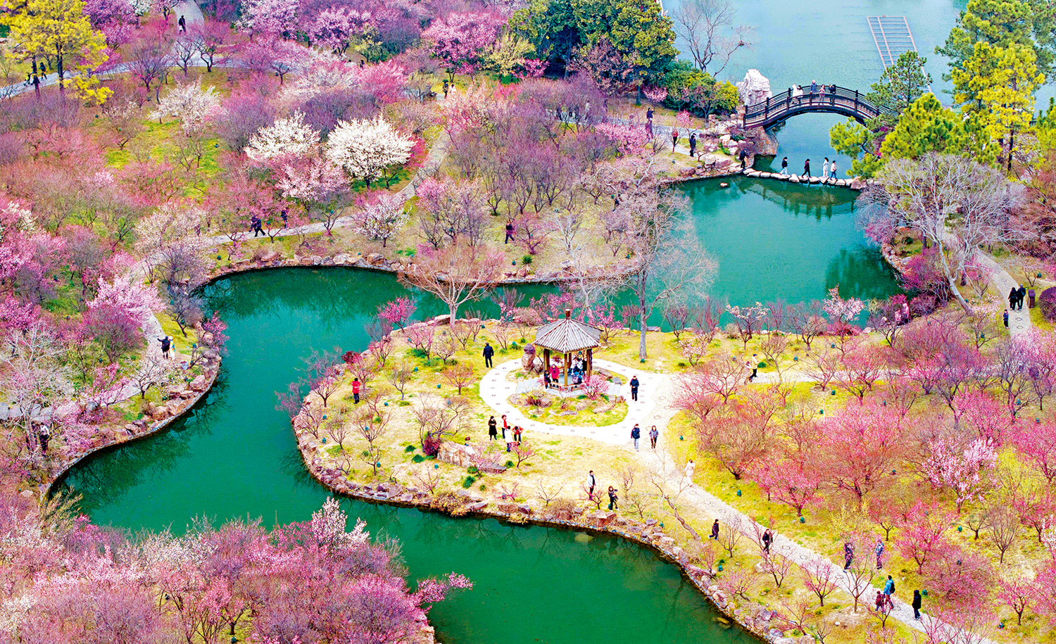 圖:神州大地春意漸濃,人們擁抱自然,享受春日美好時光。圖為近日遊客在江蘇揚州瘦西湖風景區賞梅遊玩。\新華社