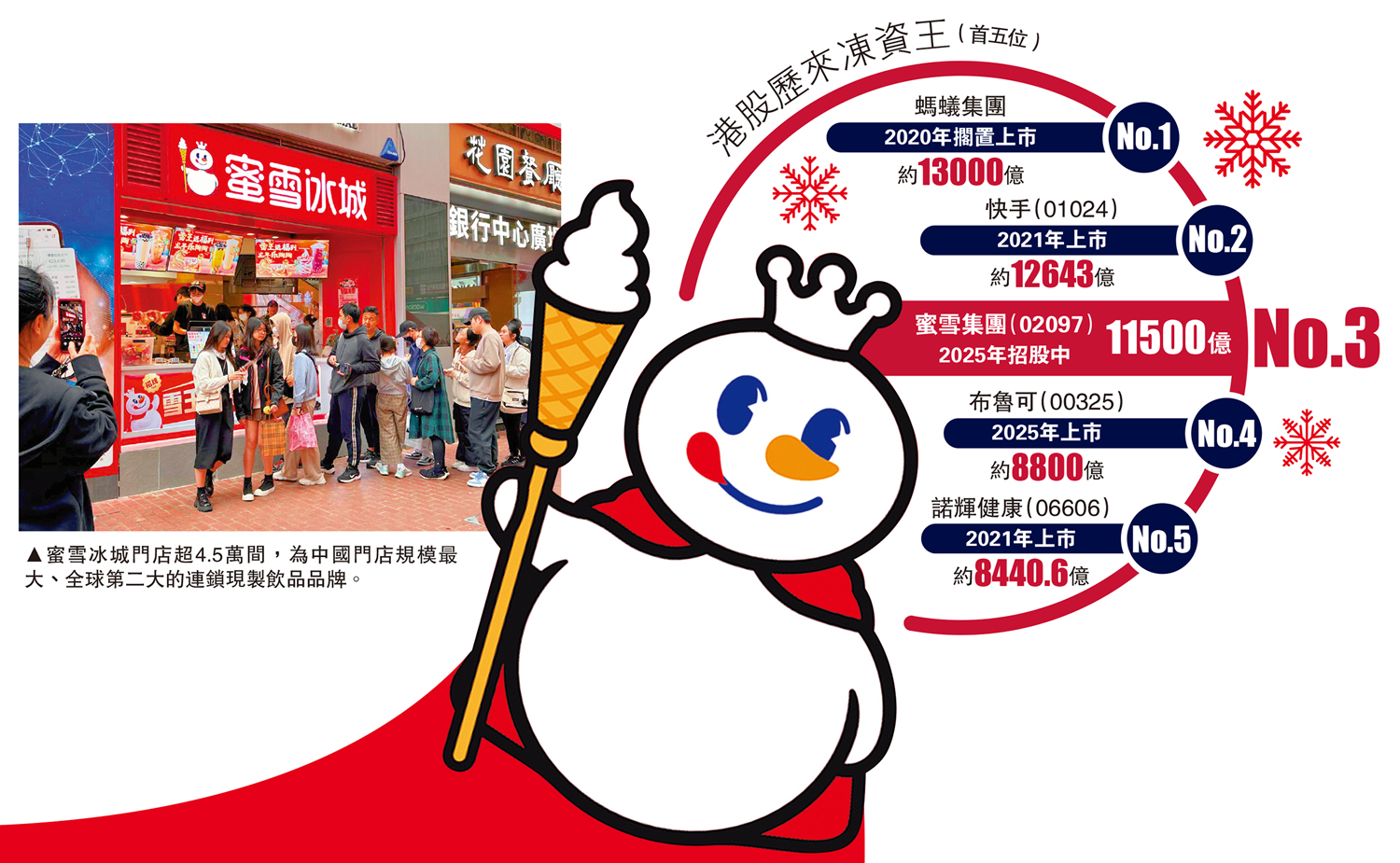 門店超過4.5萬間的蜜雪冰城,為中國門店規模最大、全球第二大的連鎖現製飲品品牌。上周展開招股首日錄得近5000億孖展認購額。截至昨日為止,累計兩日孖展認購已倍增至1.15萬億元,以供散戶參與的公開發售部分計算,已錄得3339倍超額認購。資料顯示,香港IPO歷來只有兩隻萬億級別的凍資王,分別為2020年擱置上市的螞蟻集團(約1.3萬億),以及2021年上市的快手(01024)(1.26萬億元)。值得留意的是,蜜雪將於明日(26日)才截止認購,故有機會超越螞蟻,成為本港歷來反應最熱烈新股。