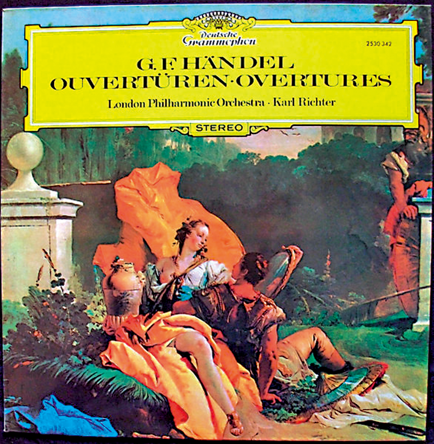 一六八五年二月二十三日,喬治·弗雷德里克·亨德爾誕生於德國哈勒市。剛剛過去的周末是這位偉大的巴洛克作曲家誕辰三百四十周年紀念日。本周應景地推薦一張亨德爾的《序曲集》。這張德意志留聲機唱片公司於一九七三年灌錄並發行的黑膠收錄了包括《阿爾辛娜》、《羅德琳達》、《里納爾多》、最後一部歌劇《戴達米亞》等共計九部亨德爾歌劇中的序曲,由德國指揮大師卡爾·李希特執棒倫敦愛樂樂團聯袂演繹。唱片封套選擇了威尼斯繪畫巨匠詹巴蒂斯塔·蒂埃波羅的畫作《里納爾多和阿爾米達在她的花園內》局部。