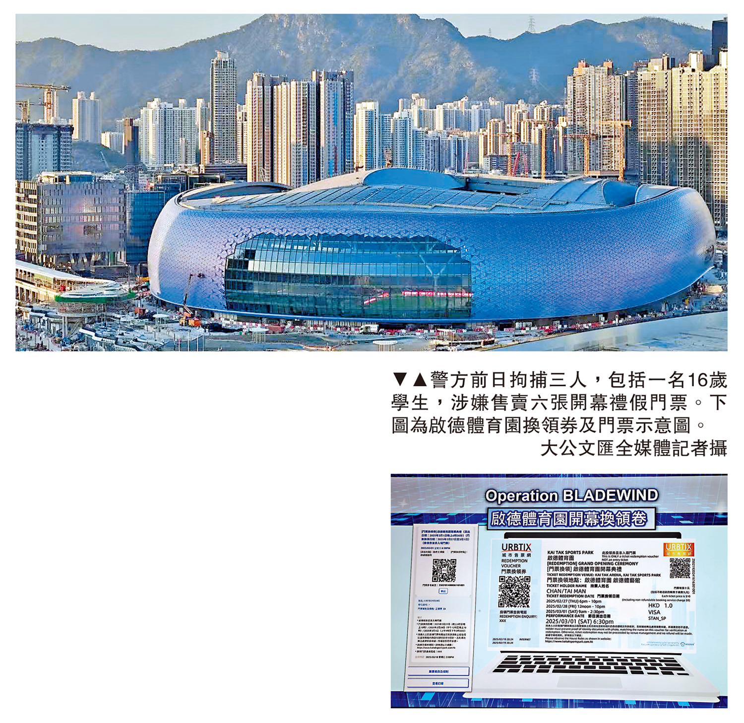 【大公報訊】記者葉浩源報道:啟德體育園將於3月1日正式開幕,開幕典禮門票上周五(21日)開售,網上隨即有「黃牛」門票炒至2000元。警方前日(24日)展開代號「刃風」行動拘捕三人,包括一名16歲學生,涉嫌售賣六張開幕禮假門票。有體育專員提醒門票的電子換領券屬具名,換作實體票時須核對兌換者身份。有議員建議警方成立專責隊伍,透過不同途徑,包括放蛇行動,持續打擊網上黃牛及假門票售賣等不法行為。