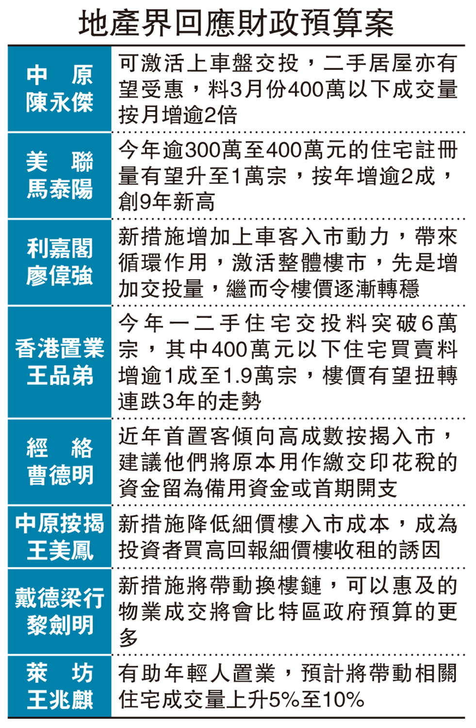 祥益地產執行董事盤嘉茵表示,屯門有收租客於預算案公布後,即時下調叫價至400萬元,物業為豐景園中層2房單位,實用面積341方呎,業主為收租客,一直開價415萬元放盤,昨日財政預算案公布將100元印花稅門檻上調至400萬元後,業主為吸引市場,隨即把單位叫價降至400萬元,減幅約3.6%。據悉,上述單位現有租客居住,月租1萬元,若以叫價賣出,新買家可享約3厘回報。