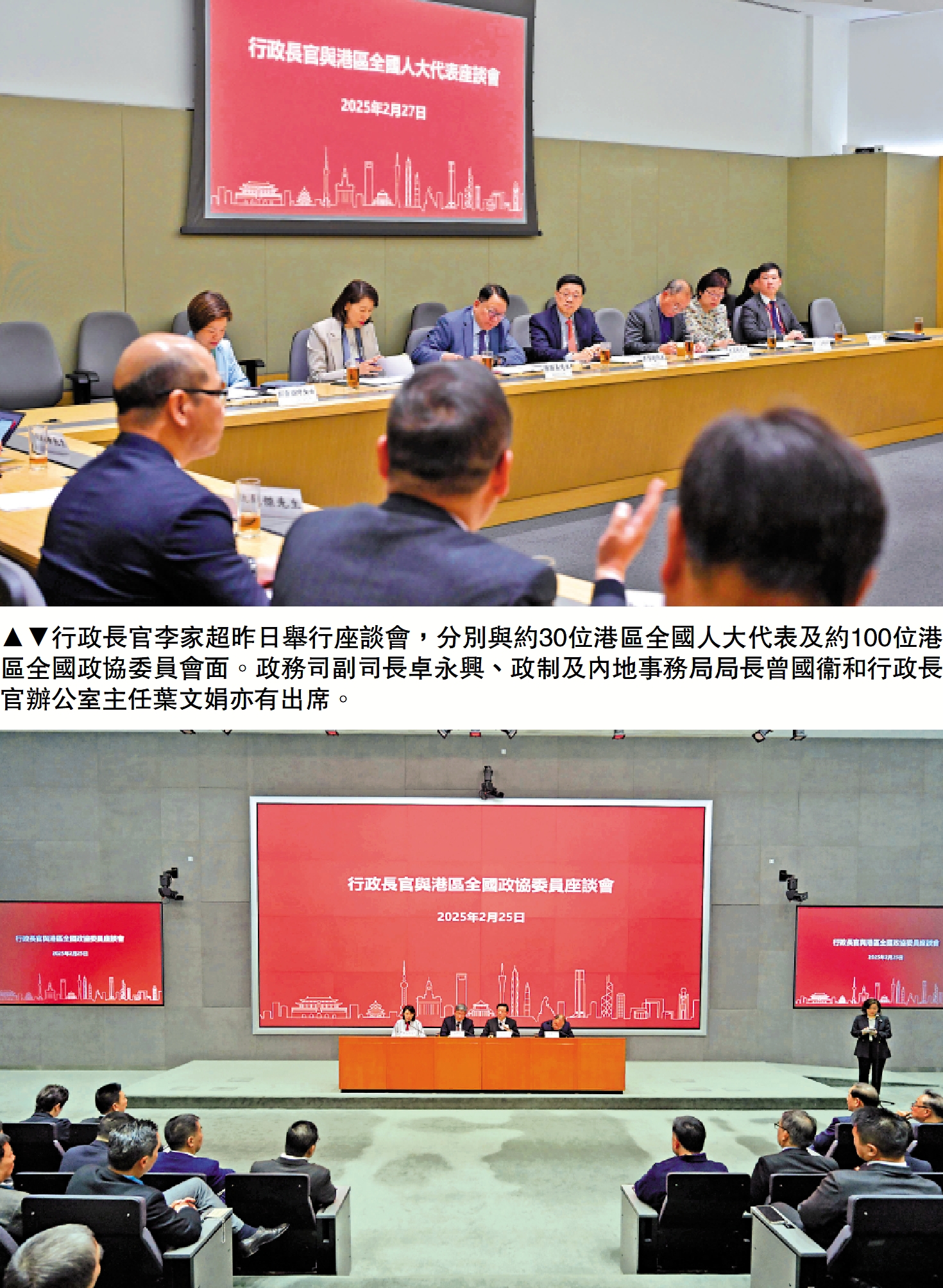 2025年全國兩會下星期在北京召開,行政長官李家超在2月25日及27日舉行座談會,分別與約100位港區全國政協委員及約30位港區全國人大代表會面,在他們出席全國兩會前交流意見。李家超感謝各代表和委員努力發揮橋樑作用,推動香港進一步融入國家發展大局。