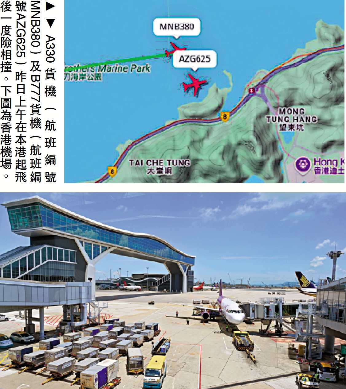 昨日上午7時許,一架由香港國際機場前往土庫曼斯坦的MNG航空A330貨機(航班編號MNB380)獲空管人員批准從香港國際機場的中跑道起飛,另一架前往巴庫的絲綢之路西部航空的B777貨機(航班編號AZG625)獲空管人員批准從南跑道起飛,兩機並按標準飛行程序離場。兩架貨機起飛後,再分別獲空管人員指示爬升至5000呎和3000呎,以保持高度分隔,但由於兩架貨機的爬升速度未如空管人員的預期,導致兩機無法實現預期的分隔高度。
