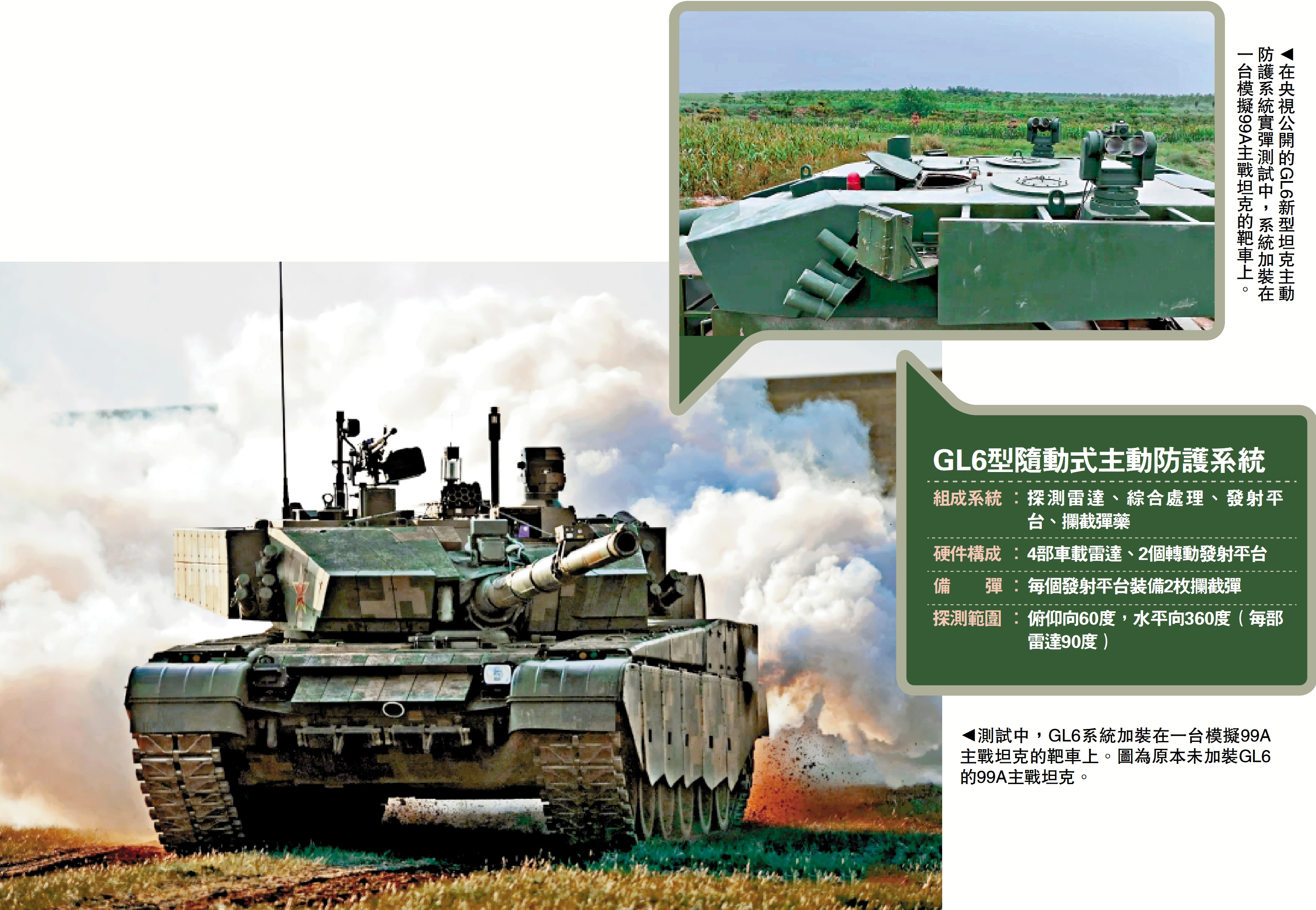 國產GL6型隨動式主動防護系統實彈測試畫面,近日首次公開,展示了其在電光火石間,及時感知多枚不同角度、不同方向的來襲武器特徵、軌跡,完成自動解算、瞄準、攔截的能力。該型「以攻代守」的系統可裝載於99A等主戰坦克或裝甲戰車上,能夠同時攔截從地面、空中來襲的火箭彈、導彈、巡飛彈、穿越式自殺無人機,為坦克構築起360度無死角的「金鐘罩」,有效提升了坦克、戰車的戰場生存能力。\馬浩亮(文)