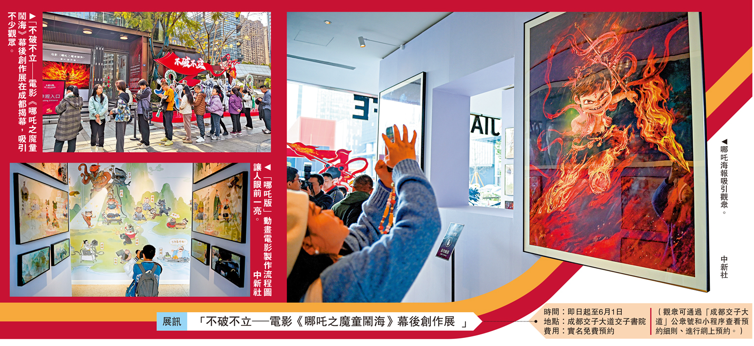 春節檔電影《哪吒之魔童鬧海》(以下簡稱「《哪吒2》」)上映一個月仍熱度不減,眾多影迷多次觀影後仍呼「不過癮」。哪吒系列電影是如何創作出來的?多個重要角色的形象設計都經過了哪些改動?主創團隊在創作中用了哪些小巧思?3月3日,「不破不立─電影《哪吒之魔童鬧海》幕後創作展在成都揭幕,首次向公眾集中揭秘這部國漫的創作歷程,展現中國動畫工業的硬核實力與文化自信。\大公報記者 向 芸(文、圖)