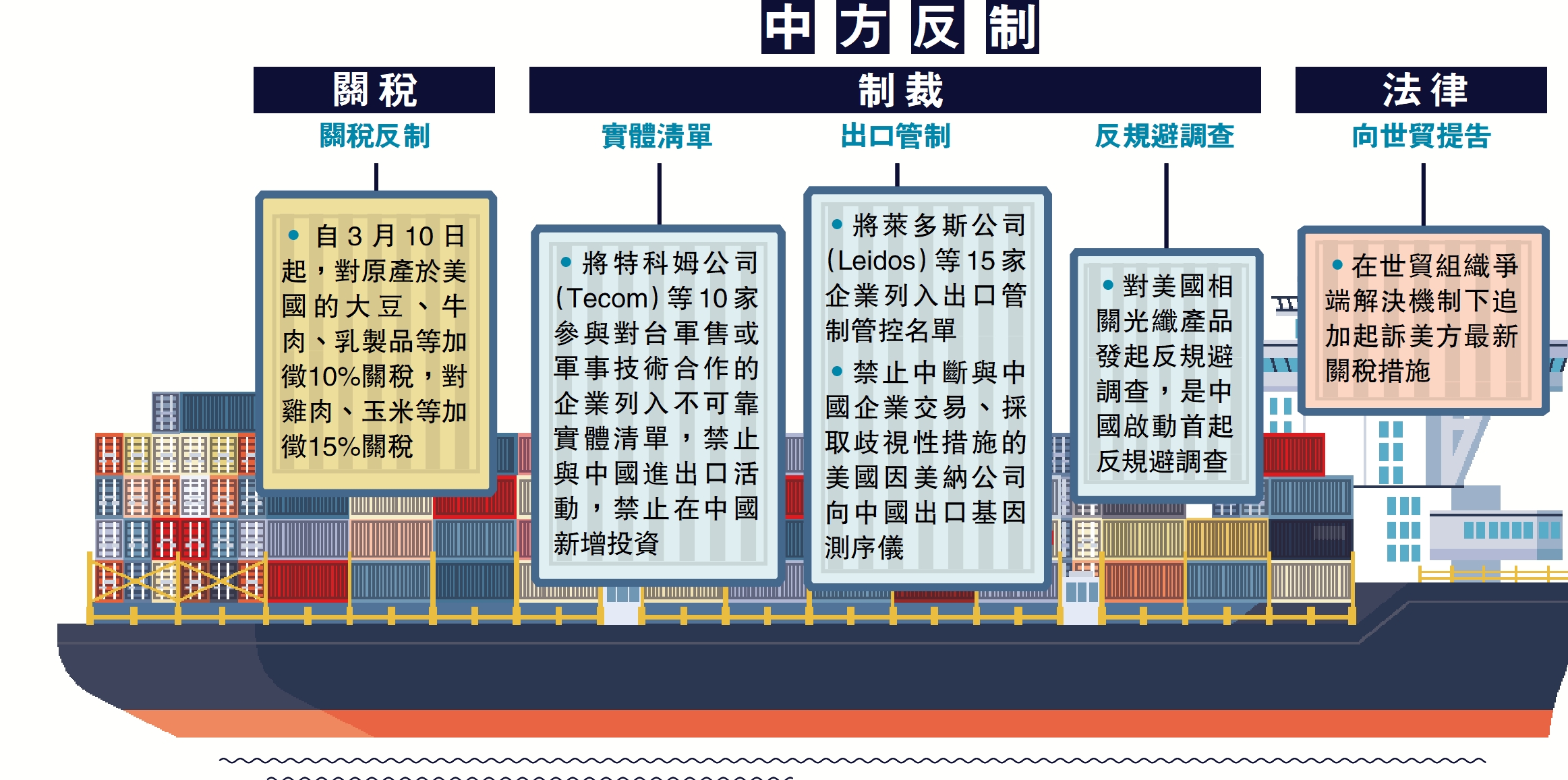雷霆反制,堅決維權。從對原產於美國的部分進口商品加徵關稅,到向世貿組織提起訴訟,從封禁包括10家對台軍售企業在內的26家美企,再到首度啟動反規避調查,劍指美相關光纖產品,中方4日接連表態發布反制措施,雷霆10連擊。香港特區政府昨日對美國宣布對香港產品再加徵一成關稅(即累計徵收兩成關稅)表示強烈不滿,會就事件向世貿提訴。\大公報記者 朱燁北京報道