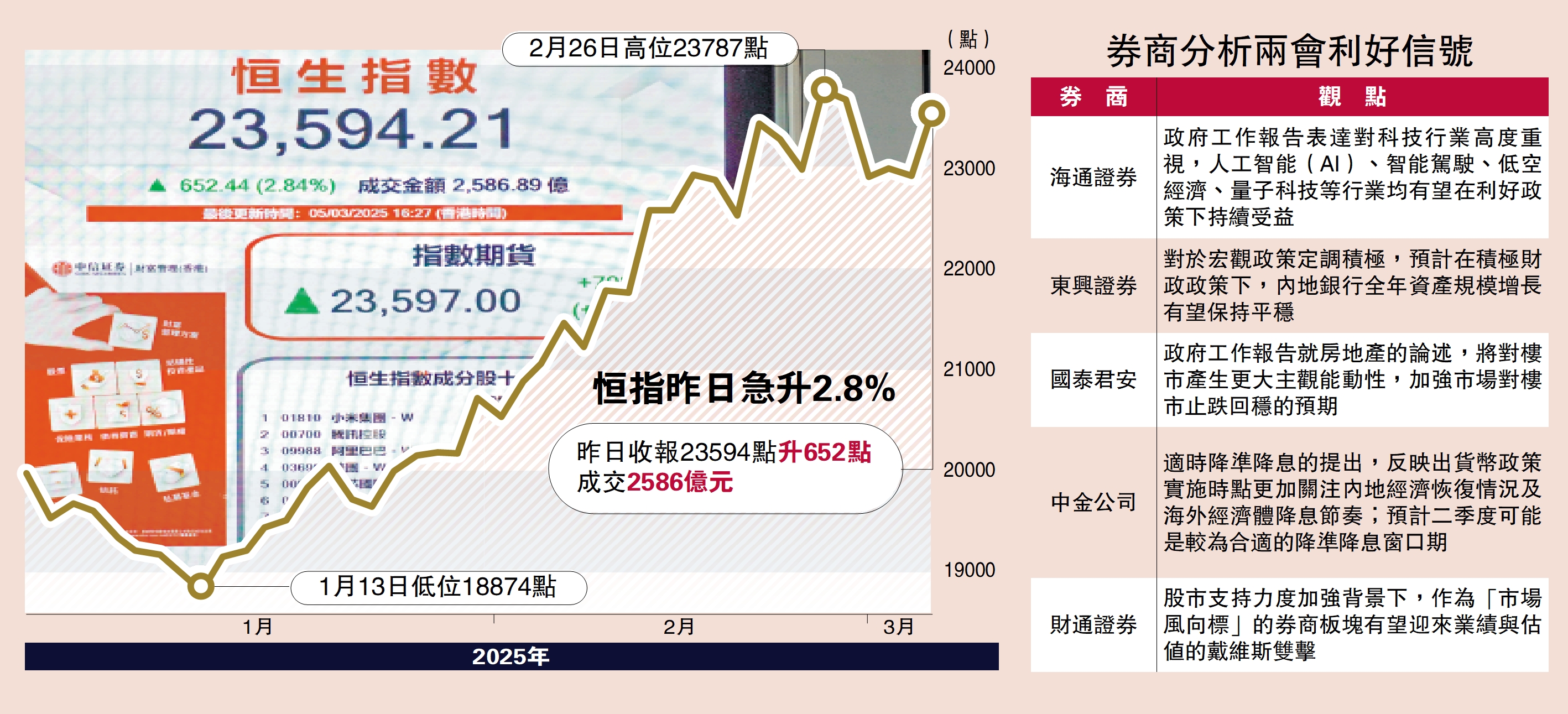 政府工作報告昨日釋放了大量利好消息,加上國家發改委等五部委今日舉行經濟主題記者會,市場憧憬有新刺激措施推出,投資者信心轉強,恒指昨日急升652點,重上23000點心理關口,收報23594點。政府工作報告提出持續推進「人工智能+」行動,國泰君安表示,2025年股市投資主線在科技。