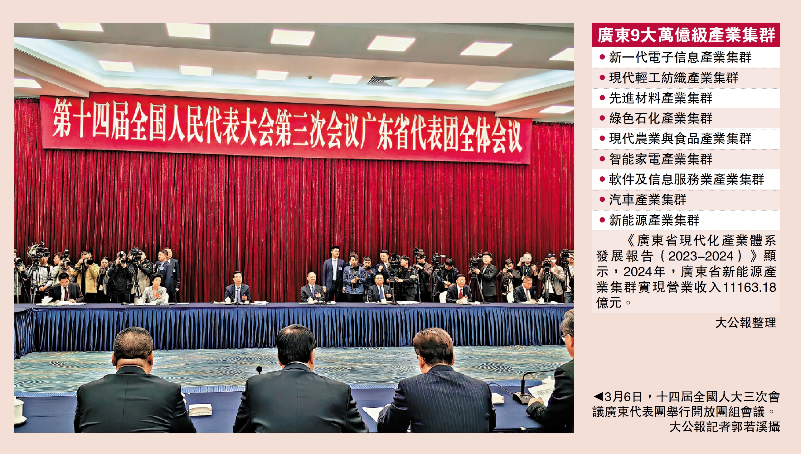 經濟大省如何挑大樑?內地第一經濟大省廣東給出的答案是「建設現代化產業體系」。6日,十四屆全國人大三次會議廣東省代表團舉行開放團組會議。全國人大代表、中央政治局委員、廣東省委書記黃坤明表示,廣東要結合實際在推動科技創新和產業創新融合上打頭陣、當先鋒,把現代化產業體系建設好、建設強。他現場首次透露,新能源產業集群已經成為廣東第9個萬億級產業集群。