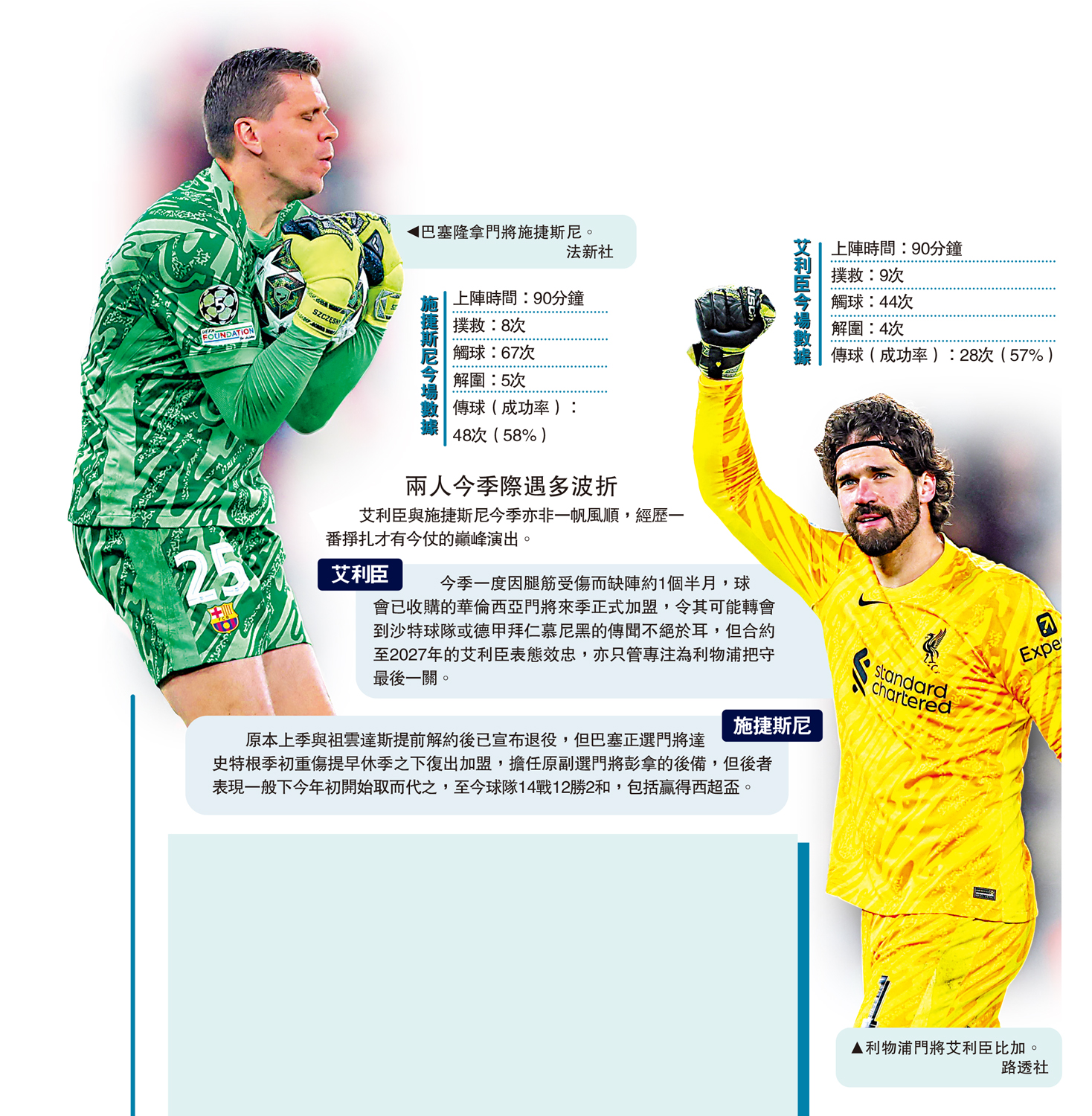 昨晨歐聯16強首回合,英超利物浦與西甲巴塞隆拿不約而同在極惡劣的形勢下,作客「一劍封喉」分別挫敗法甲巴黎聖日耳門和葡超賓菲加,然而兩隊贏波的最大英雄,也許並非兩位入球者,而是全場分別作出9次化險的艾利臣比加及8次撲救的施捷斯尼,幸得兩位門將「神級演出」,球隊才奠下勝利基礎。\大公報記者 譚德龍