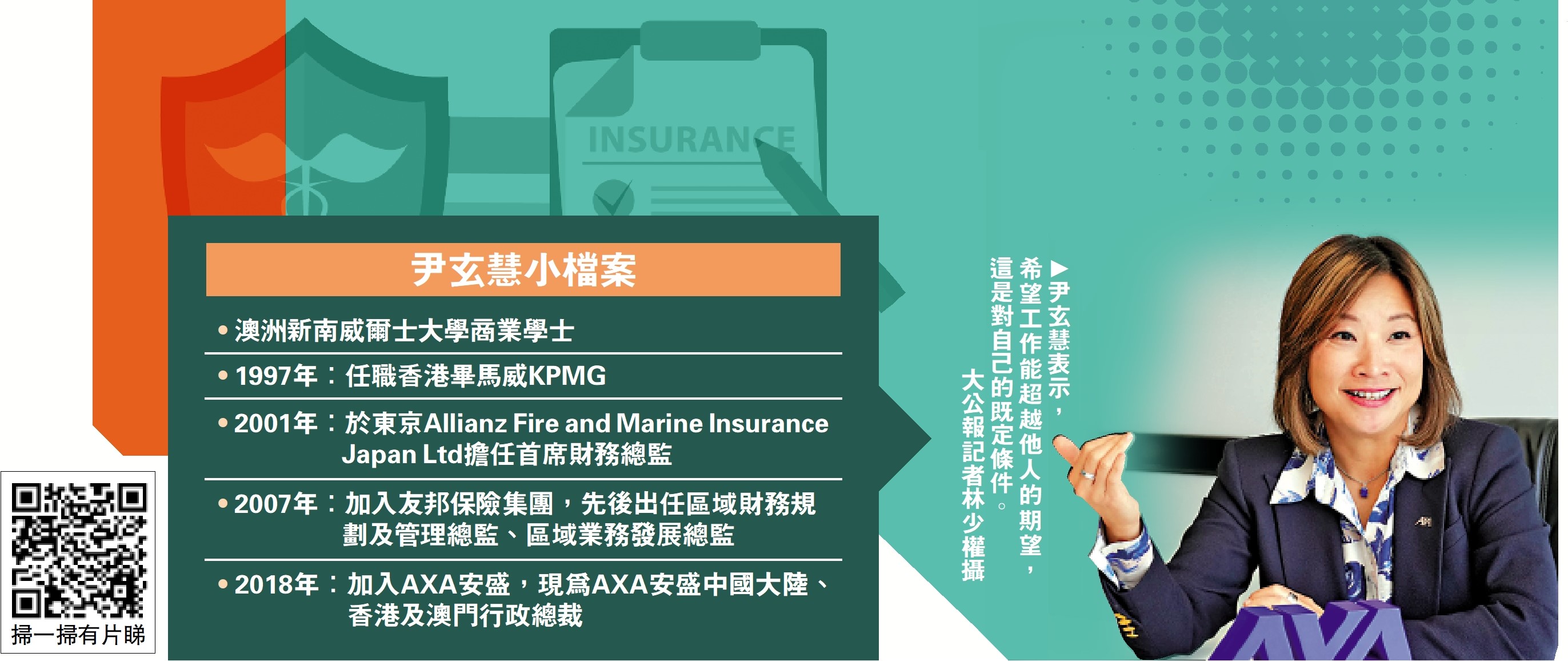 「在每一份工作裏,都盡量exceed expectations(超出預期),希望能超越他人的期望,這是我對自己的既定條件。」在澳洲學成歸來後從事審計工作的尹玄慧,經過多年努力,早年成為AXA安盛香港首位華人女CEO(行政總裁),她自言從沒有追名逐利的心態,只是堅持不懈地力爭做到一絲不苟,加上稍有運氣助攻,交出的「功課」永遠有過之而無不及。