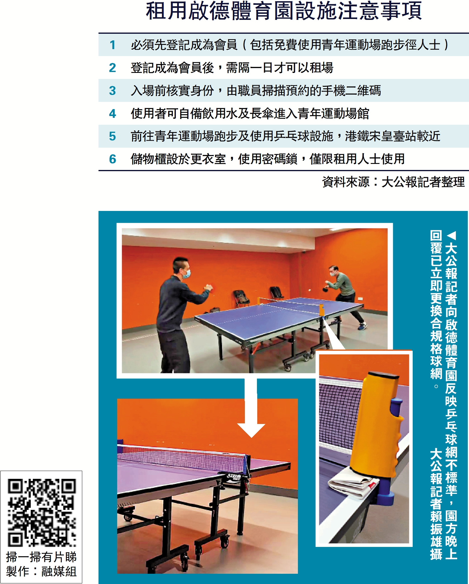 大公報記者向啟德體育園反映乒乓球室的幾項問題,至晚上園方回覆已立即更換合規格球網,並換上可完全遮隔的圍欄,由於設施剛開放,會吸納使用者意見,逐步改善。