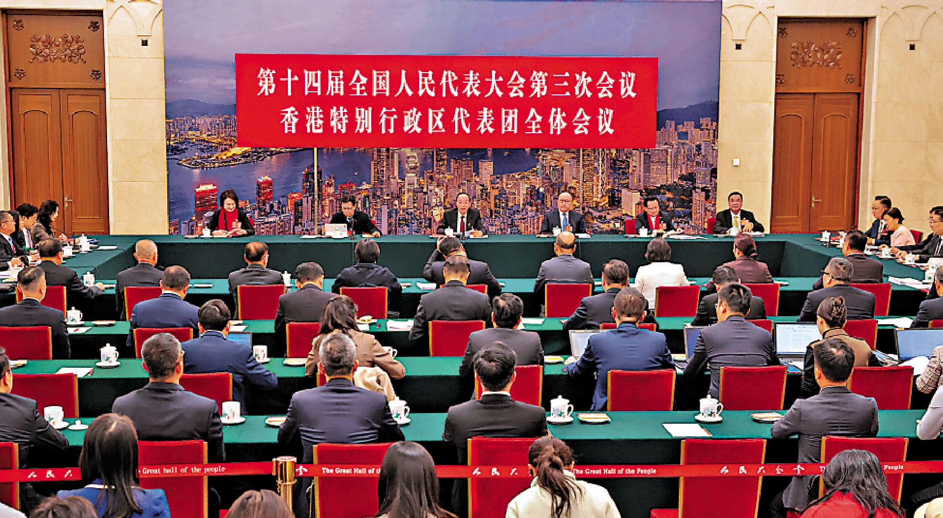 十四屆全國人大三次會議香港特區代表團昨日在人民大會堂香港廳舉行全體會議,審議政府工作報告,中央政府駐港聯絡辦主任鄭雁雄參加審議。會議上,有21位代表積極發言,共謀香港與國家共同發展的新篇章。有代表認為,人工智能將成為國家和香港經濟發展,以及產業升級的重要驅動力,希望香港未來能夠緊密配合國家發展戰略,發揮自身的優勢,為國家發展做出新的貢獻。有代表強調文化產業的發展,提議將香港打造成中華文化的「金融港」和「出口港」。