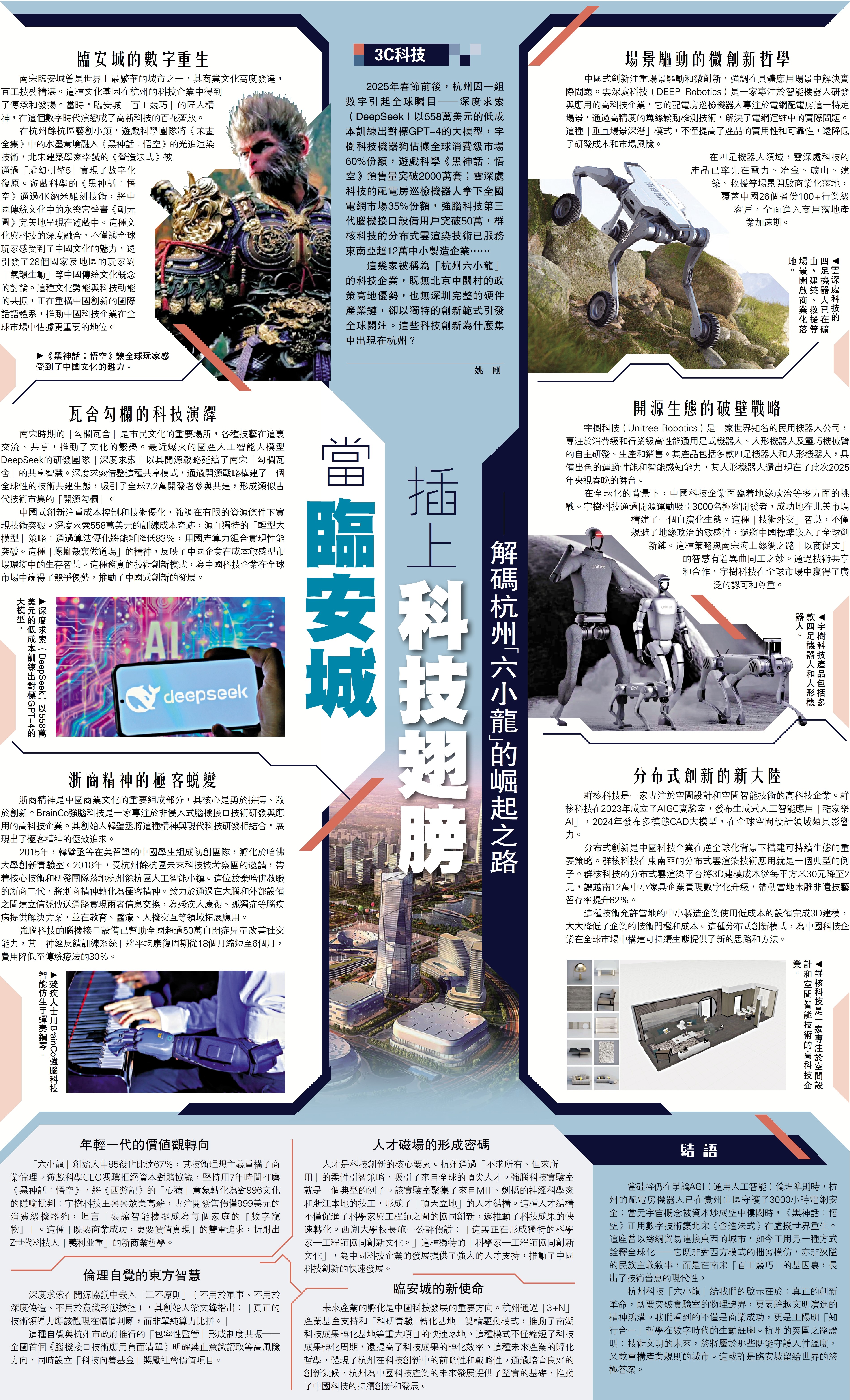 2025年春節前後,杭州因一組數字引起全球矚目─深度求索(DeepSeek)以558萬美元的低成本訓練出對標GPT-4的大模型,宇樹科技機器狗佔據全球消費級市場60%份額,遊戲科學《黑神話:悟空》預售量突破2000萬套;雲深處科技的配電房巡檢機器人拿下全國電網市場35%份額,強腦科技第三代腦機接口設備用戶突破50萬,群核科技的分布式雲渲染技術已服務東南亞超12萬中小製造企業……