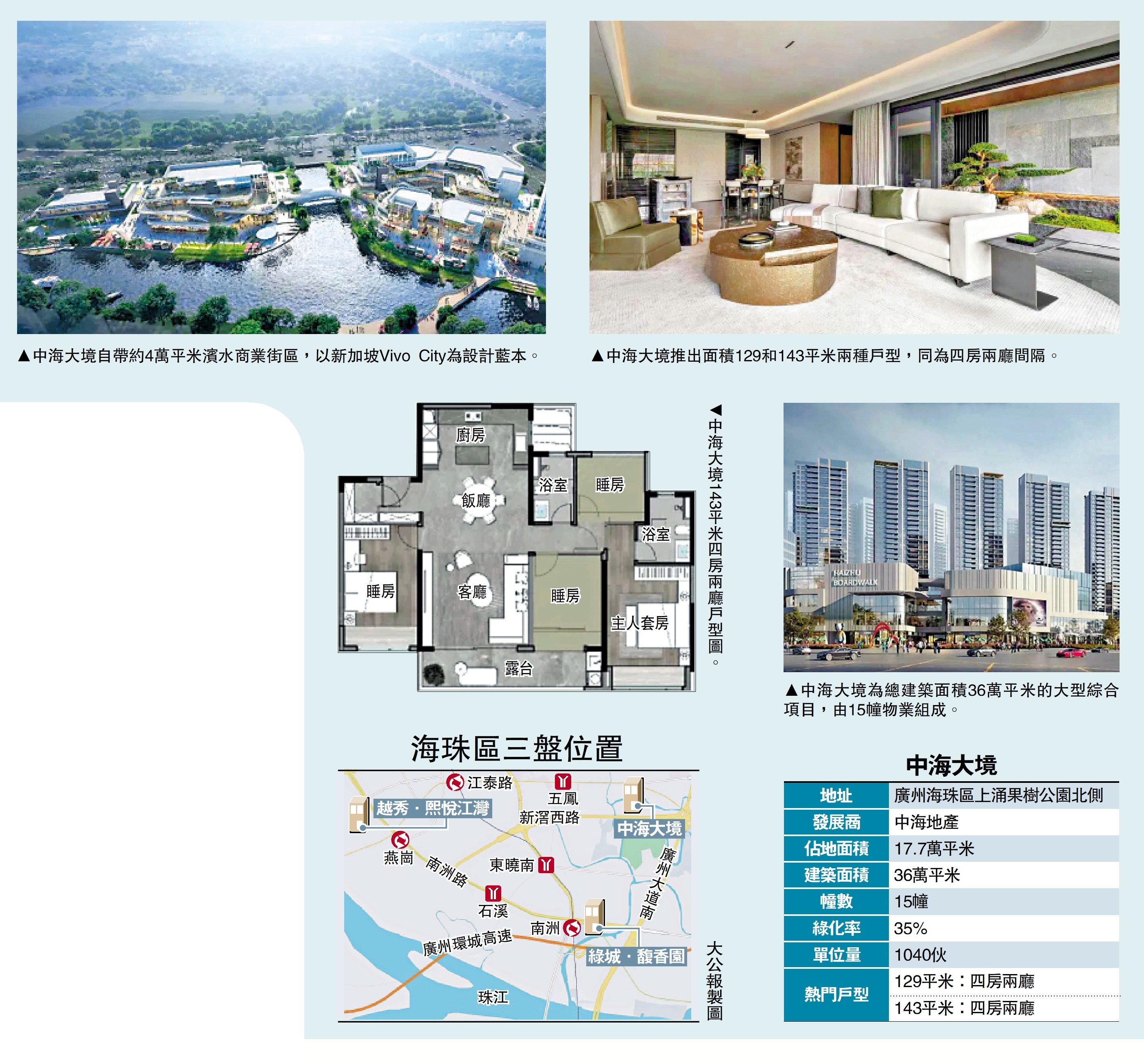 項目銷售人員牛先生表示,中海大境不僅是豪宅項目,更是一個總建築面積達36萬平米的超級綜合體。他介紹,步行10分鐘範圍內,項目周邊商業配套豐富,已聚集海珠萬達、合生廣場等逾20萬平米的商業集群。「在廣州市中心,這樣規模的綜合性項目極為罕見。」他介紹,中海大境的商業規劃以新加坡Vivo City為藍本,打造多層「城市甲板」概念的濱水商業街區,未來將成為廣州的新晉打卡點。