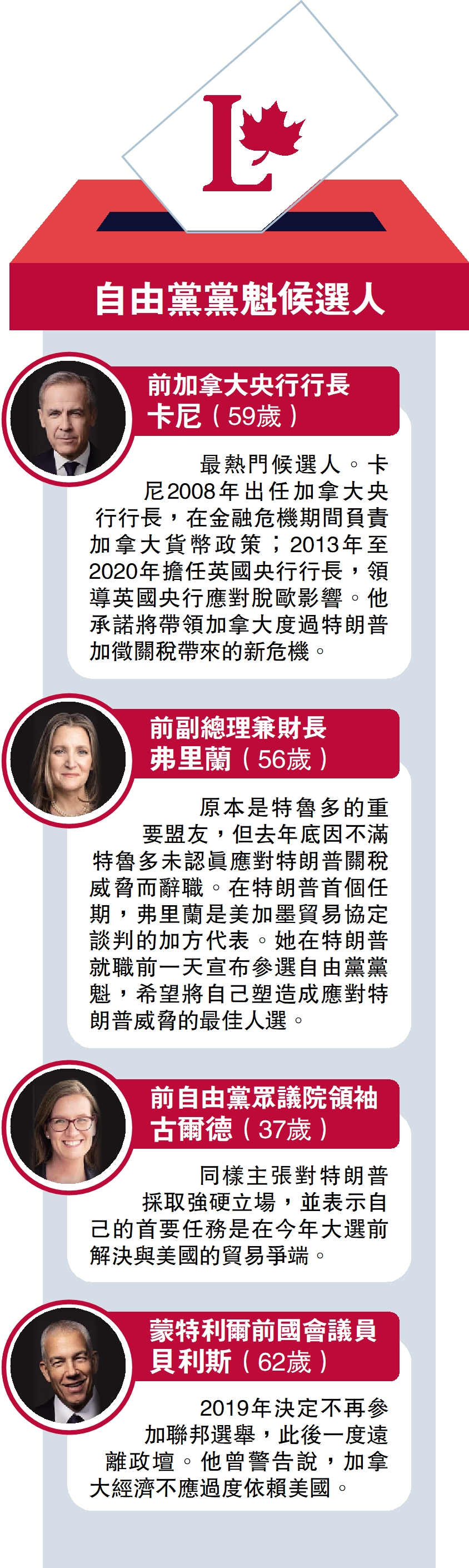 最熱門候選人。卡尼2008年出任加拿大央行行長,在金融危機期間負責加拿大貨幣政策;2013年至2020年擔任英國央行行長,領導英國央行應對脫歐影響。他承諾將帶領加拿大度過特朗普加徵關稅帶來的新危機。