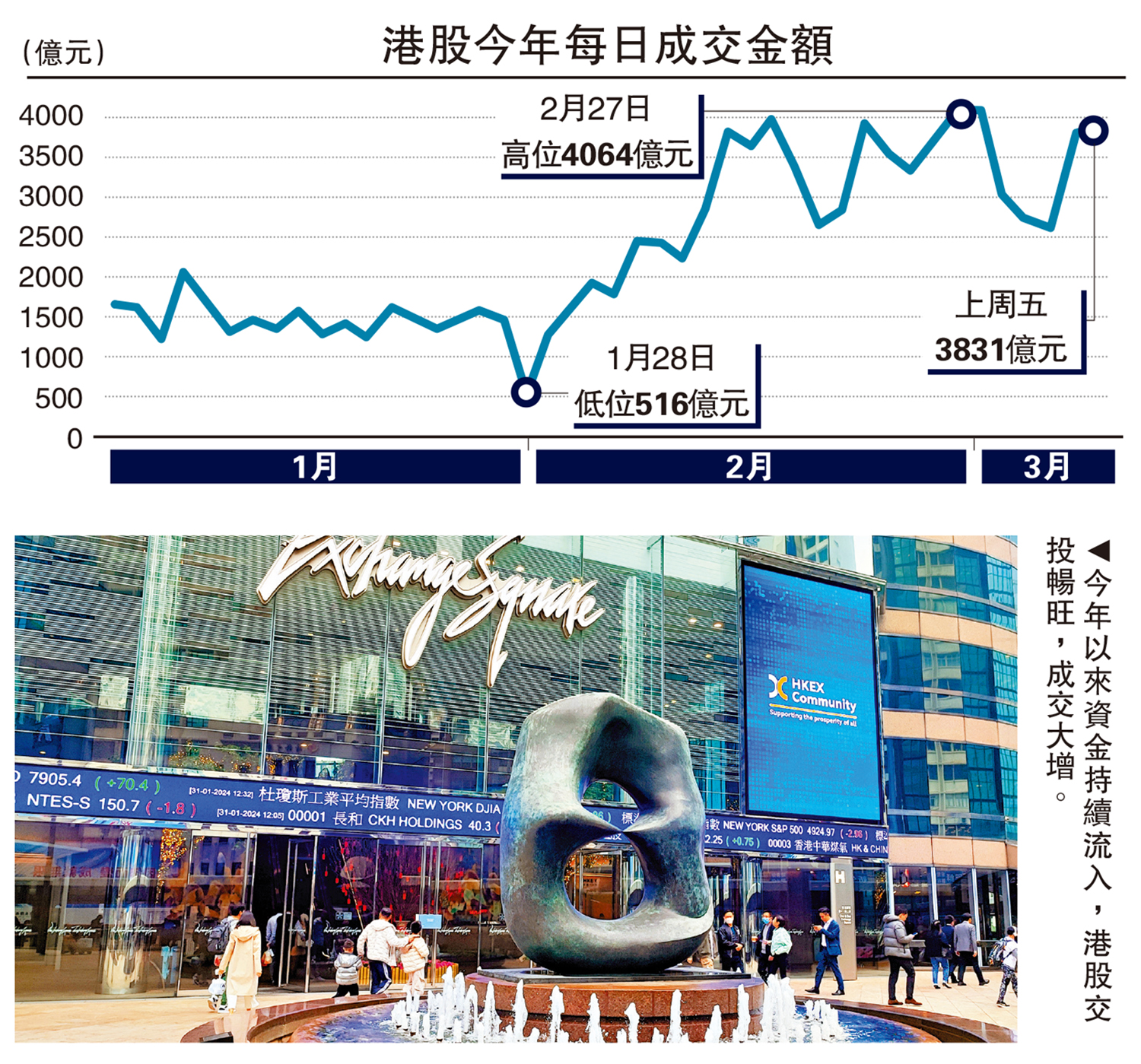 受惠於兩會利好消息,港股交投暢旺,恒指亦曾重上24000點,見3年高位。根據港交所的資料顯示,2月份港股日均成交額高達2973億元,按年增長2.3倍;而在3月首周亦保持在3000億元左右,反映資金持續流入港股。新股市場亦穩步回升,首兩個月的新股集資額為78億元,按年上升2.6倍;截至2月底,新股上市申請數目累計有137宗。