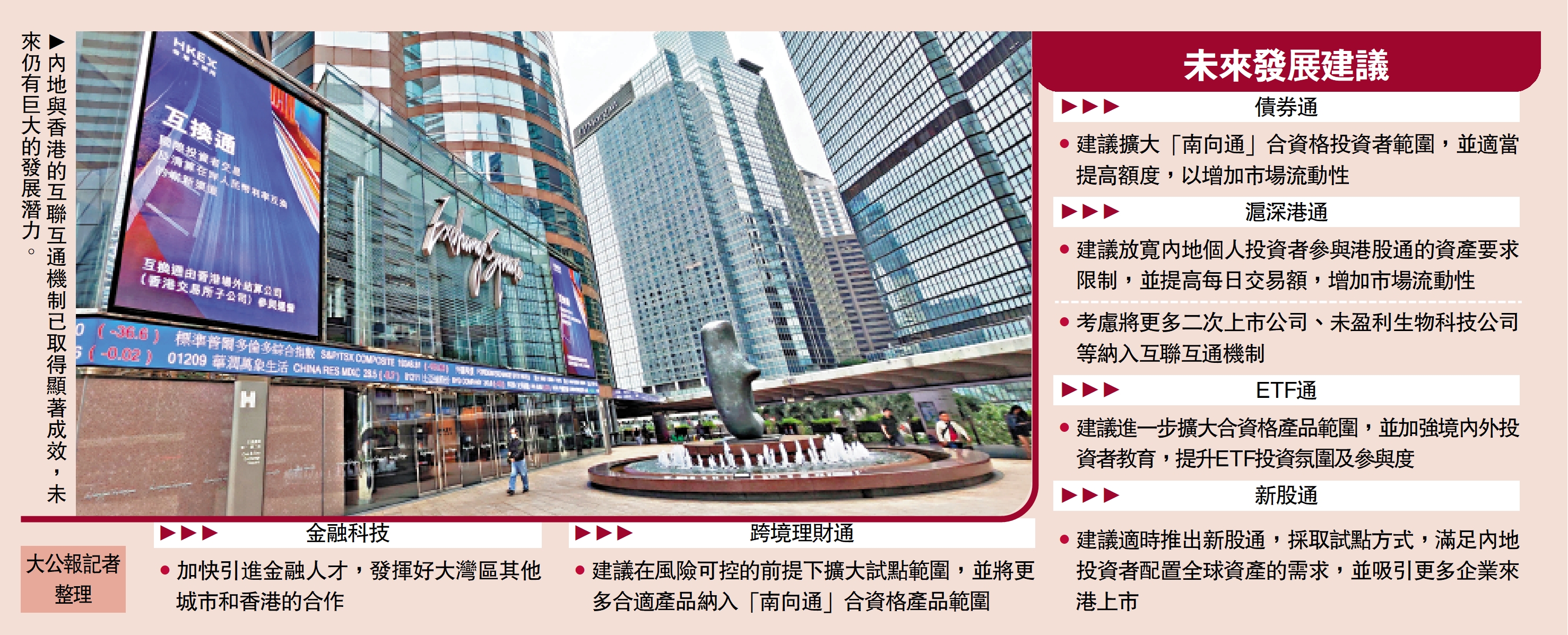 王冬勝提出多項具體建議,以債券通為例,他建議擴大「南向通」合資格投資者範圍,並適當提高額度,以增加市場流動性;滬深港通則建議放寬內地個人投資者參與港股通的資產要求限制,並提高每日交易額,增加市場流動性。同時,可考慮將更多二次上市公司、未盈利生物科技公司等納入互聯互通機制。