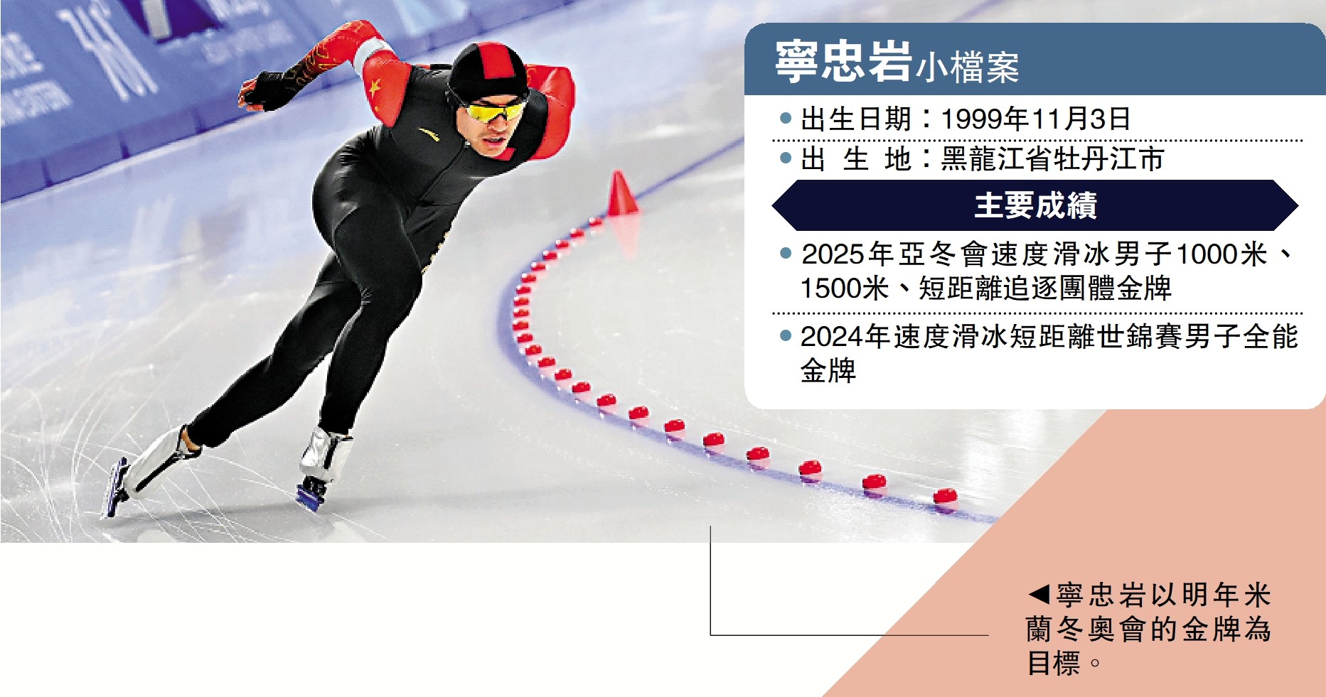 哈爾濱亞冬會開幕式上,中國代表團選擇速滑名將寧忠岩和自由式滑雪新秀劉夢婷作為旗手。能夠擔任中國代表團的旗手,這說明寧忠岩如今已成為中國冰雪軍團的核心選手。在遺憾錯過北京冬奧會獎牌後,正處於職業生涯巔峰的寧忠岩希望能夠在明年米蘭冬奧會上彌補北京冬奧會的遺憾,向金牌發起衝擊。\大公報特約記者 史玄之