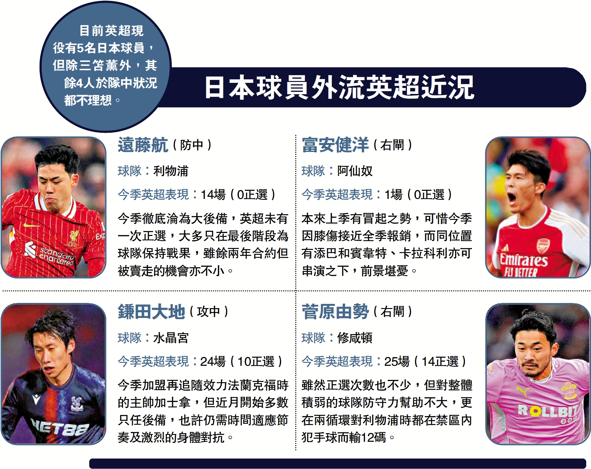 目前英超現役有5名日本球員,但除三笘薰外,其餘4人於隊中狀況都不理想。