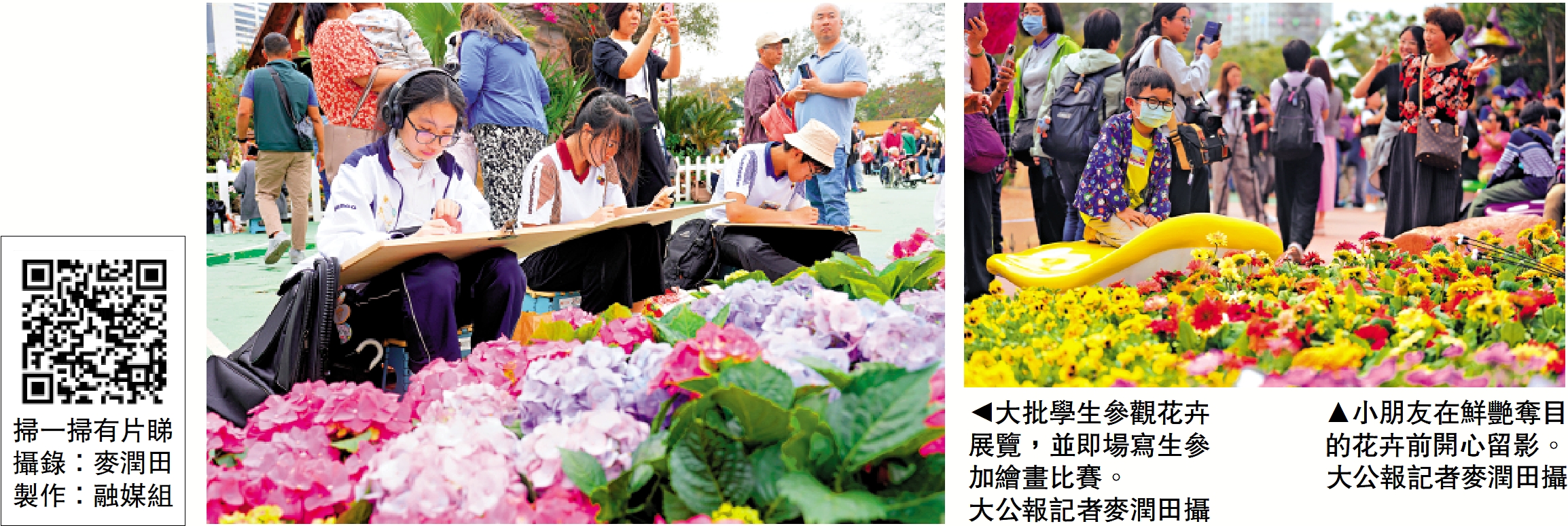 【大公報訊】記者古倬勳報道:一年一度的香港花卉展覽昨日起在銅鑼灣維園舉行,今年以秋英(又稱為大波斯菊)為主題花,以「綻放英姿」為主題,展出約40萬株花卉,包括約4萬株秋英。花卉展首日雖然多雲有雨,但仍不阻市民參觀的熱情,紛紛打卡拍照,亦有學生在花海周圍寫生,氣氛熱鬧。