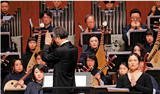 同樣經過二度改編的《苦怨》,由女高音龔麗妮唱出東漢蔡文姬離別與歸家的嗟嘆,末段樂師們由鐘聲伴奏下吟唱觀音菩薩六字真言。這一幕在下半場的《虞姬願》末段再現。全曲五個樂章最後一個音符結束時,指揮與女高音雙手合十靜立半晌(附圖),也應了作曲家所言:「以深廣的慈愛與悲憫,祈願世界和平!」