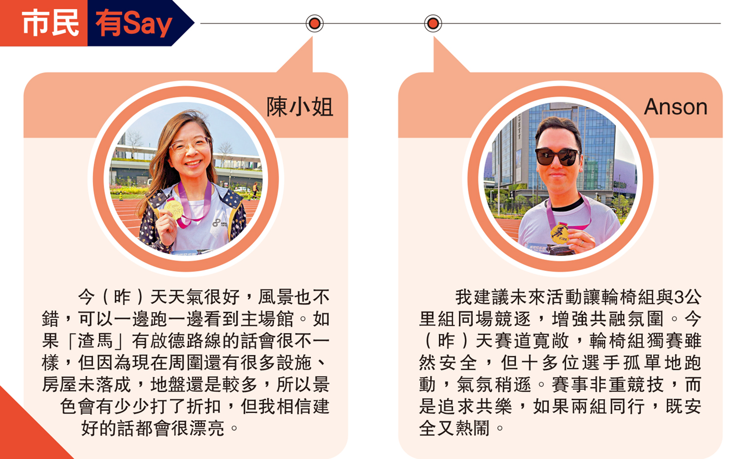我建議未來活動讓輪椅組與3公里組同場競逐,增強共融氛圍。今(昨)天賽道寬敞,輪椅組獨賽雖然安全,但十多位選手孤單地跑動,氣氛稍遜。賽事非重競技,而是追求共樂,如果兩組同行,既安全又熱鬧。