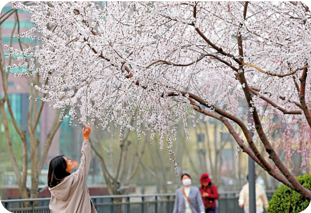 北京朝陽亮馬河畔,山桃花盛開,吸引市民拍照留念。\中新社