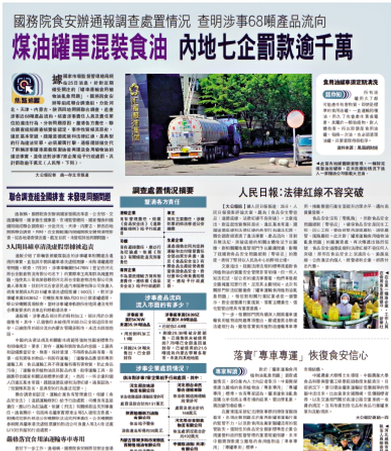 【大公報訊】記者任芳頡、郭瀚林北京報道:中共中央辦公廳、國務院辦公廳近日發布關於進一步強化食品安全全鏈條監管的意見。針對食用農產品種植養殖和食品生產、貯存、運輸、寄遞和配送、銷售、消費、進口等覆蓋從農田到餐桌全鏈條各環節監管銜接存在的問題,意見部署了8個方面協同監管機制,共21條具體措施。其中提到,依法建立散裝液態食品運輸准運制度,明確運輸散裝液態食品車輛的食品安全准入條件和技術標準,核發食品准運證明,確保專車專用;加強網絡訂餐線上線下一體化監管,推動平台和商戶實行「互聯網+明廚亮灶」,強化無堂食外賣監管和社會監督。