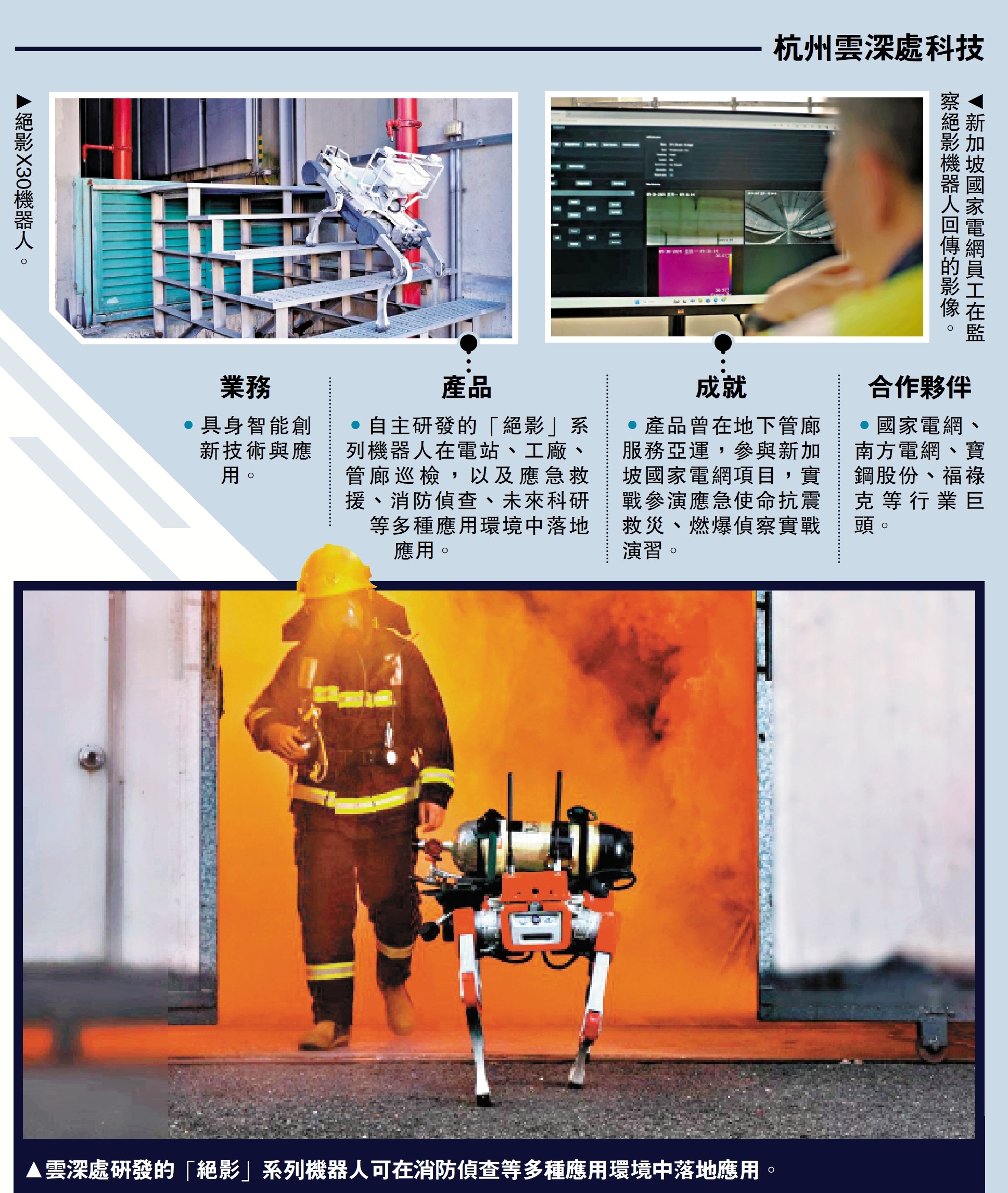 「讓機器人走出實驗室」是杭州「六小龍」之一、雲深處科技創始人朱秋國最初的創業夢想。「這是學生時期老師對我們的要求。聽到這個要求,我覺得我的夢想被點燃了。希望我們創造出來的機器人,不僅是實驗室裏科學研究的載體,更要在人類的現實生產生活中創造更大價值。」如今,雲深處智能四足機器人(機器狗)已多次開創中國相關領域先河,在電力巡檢、建築、救援等複雜、危險場景,更安全高效地代替人工作業。\大公報記者 王莉