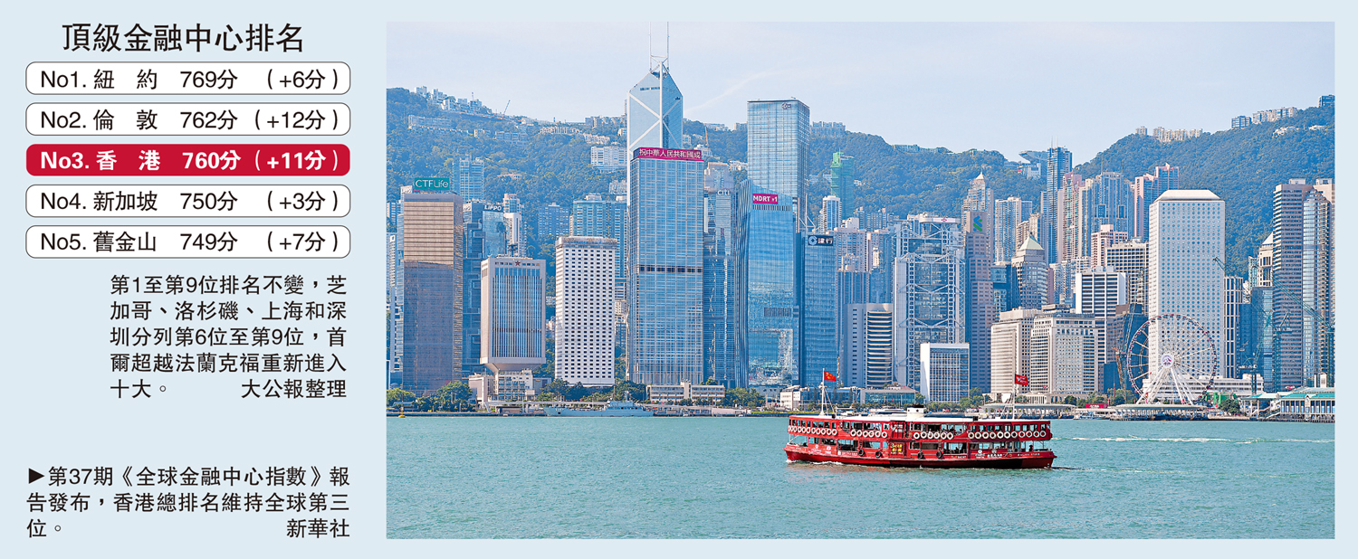 【大公報訊】英國Z/Yen集團與中國(深圳)綜合開發研究院昨日聯合發布第37期《全球金融中心指數》報告,香港的整體評分上升11分至760分,與首位的評分差距略為收窄。香港總排名維持全球第三位,並在亞太區繼續居首。