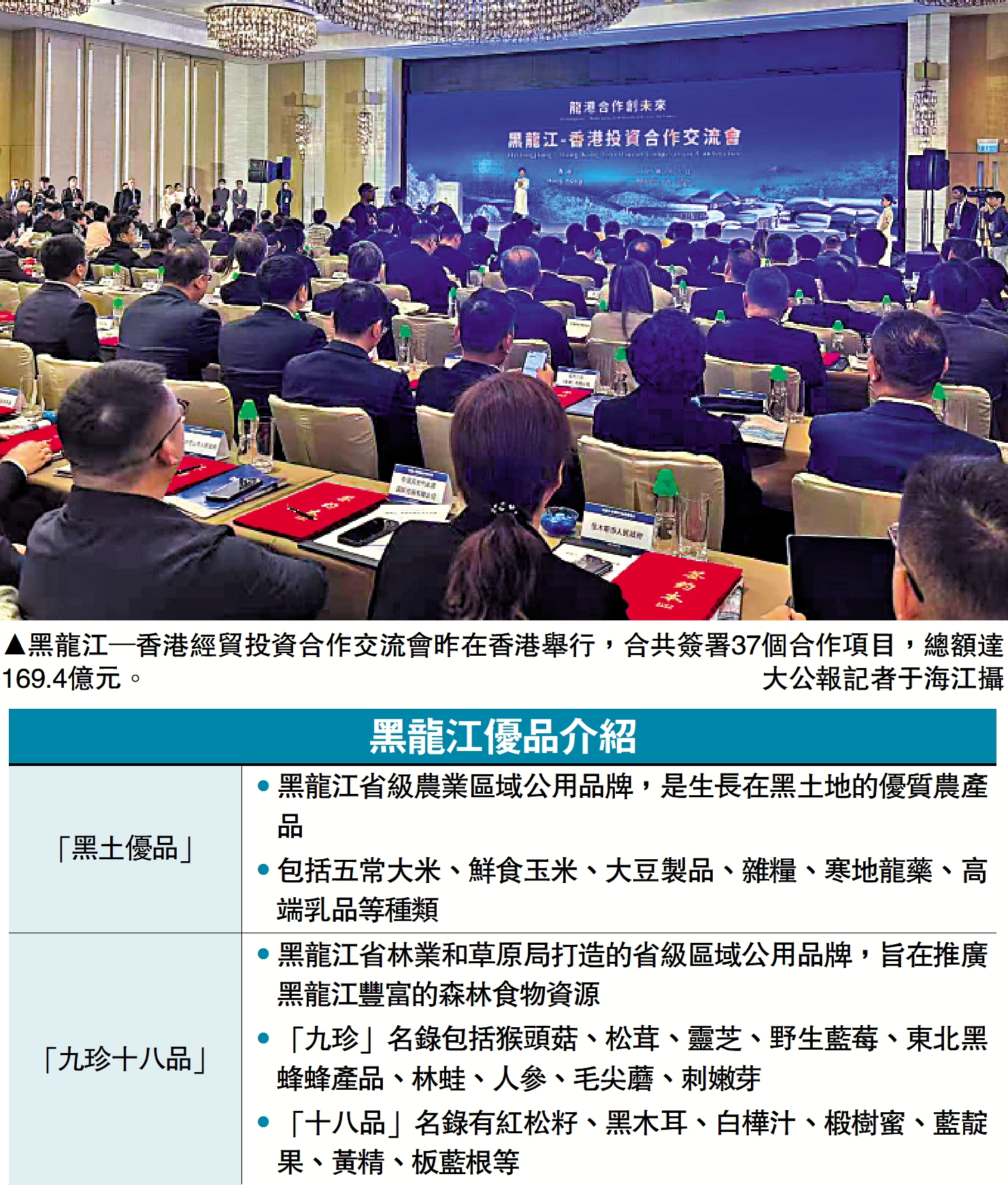 「黑龍江─香港經貿投資合作交流會」昨日在香港舉行,兩地在特色文化旅遊、黑土優品、定製農業及向北開放等領域簽署37個合作項目,總額達169.4億元(人民幣,下同)。面對粵港澳大灣區建設與東北全面振興的戰略機遇,黑龍江省委書記許勤表示,將加快龍港合作,在冰雪裝備領域引入香港工業設計資源,在碳匯交易市場嫁接香港綠色金融工具,並創新跨境旅遊「一程多站」通關模式。此外,兩地高校聯合成立的「寒地經濟研究院」即將掛牌,首期將開展凍土區基礎設施建設等20項研究問題。\大公報記者 焦紅瑞 于海江