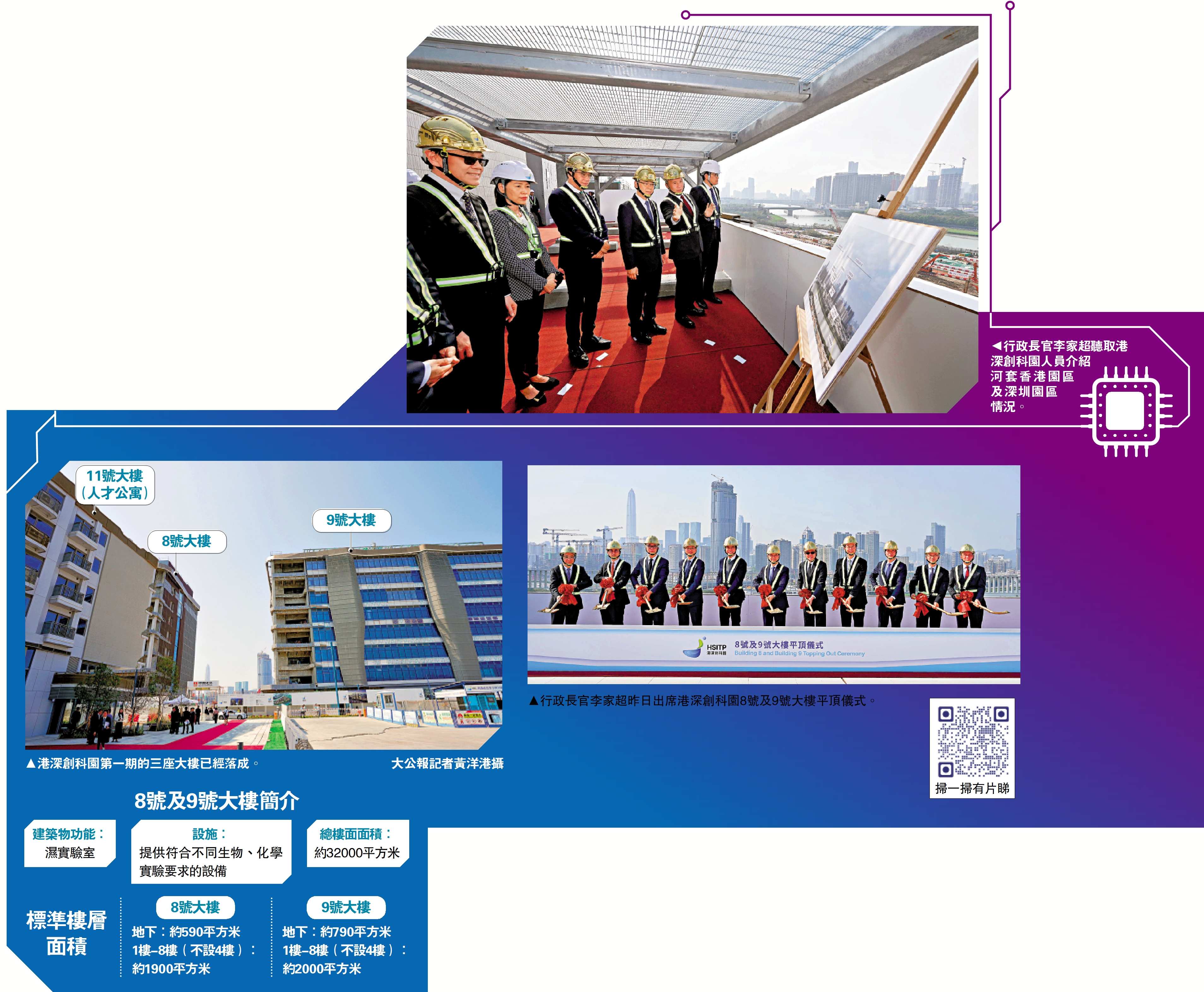 位於北部都會區的河套港深創新及科技園8號及9號大樓,昨日舉行平頂儀式,11號大樓亦全面完工,標誌着香港特區在創新科技和港深創科合作領域踏上新台階。園區今年下半年將迎來首批涵蓋生物科技、人工智能、新能源、數據科技等支柱產業的租戶進駐,正式進入營運階段。