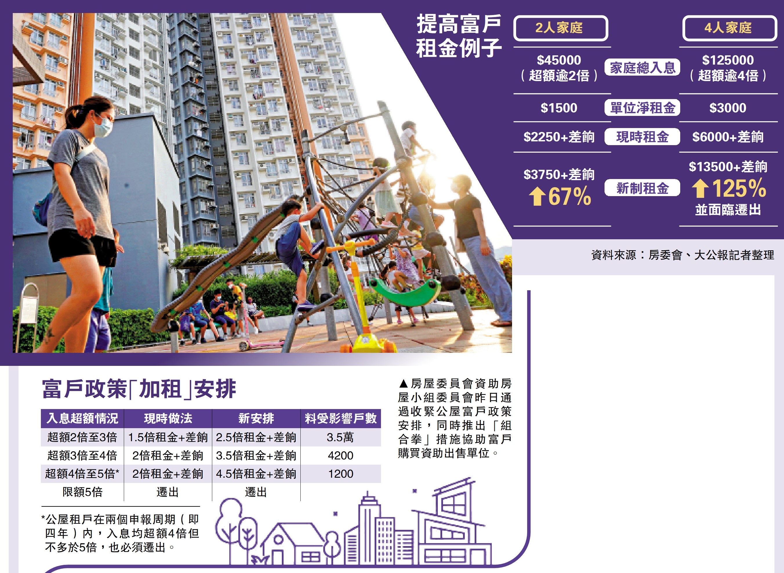 為善用公營房屋資源,房屋委員會資助房屋小組委員會昨日通過收緊公屋富戶政策安排,提高富戶額外租金到2.5至4.5倍,若連續四年入息超過限額四倍須遷出單位;同時推出「組合拳」鼓勵富戶向上流動,10月起富戶若自願遷出公屋可保留四年綠表資格,而下期居屋起會增加綠表配額至50%,協助富戶購買資助出售單位。