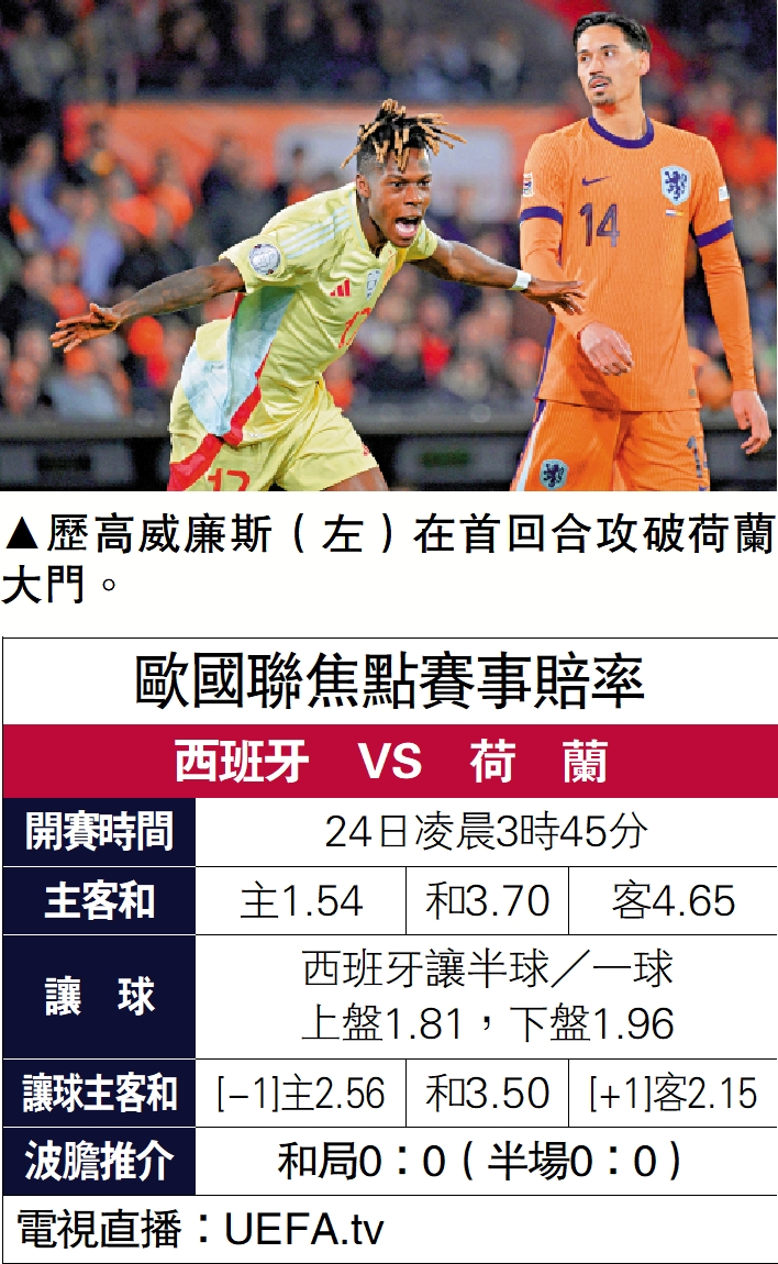 【大公報訊】綜合ESPN FC、香港賽馬會足智彩報道:歐洲國家聯賽8強次回合、西班牙主場對荷蘭明晨開打,雙方首回合打成平手,最近交鋒亦多和局收場,今次淘汰賽大戰估計亦會比較保守,雙方最近狀態差不多的情況下,投注入球大細的「細」應有不錯勝算。(UEFA.tv明天凌晨3時45分直播)