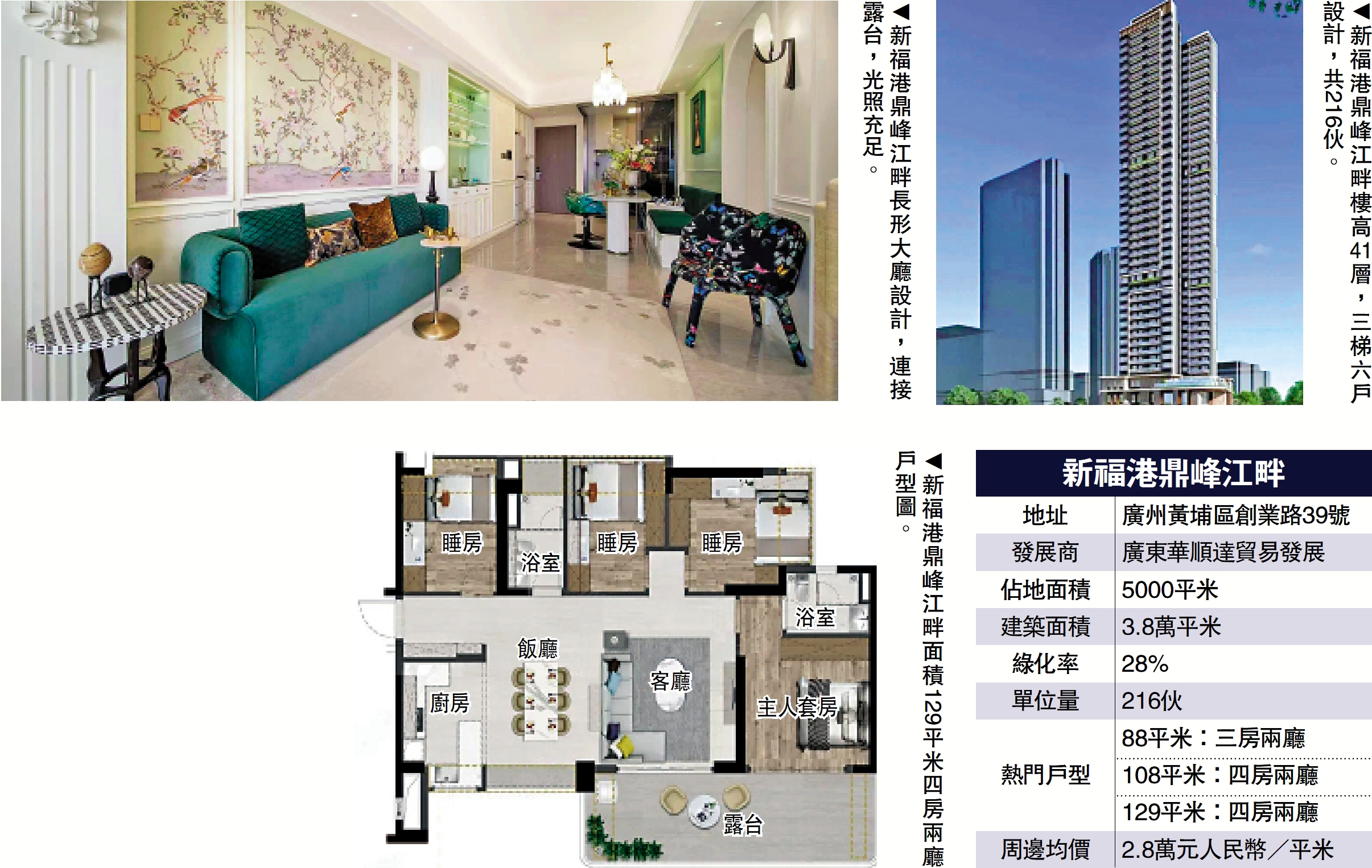 戶型方面,新福港鼎峰江畔樓高41層,三梯六戶設計,共216伙,主推88平米三房、108至118平米小四房及129平米橫廳大四房共4個面積段產品。