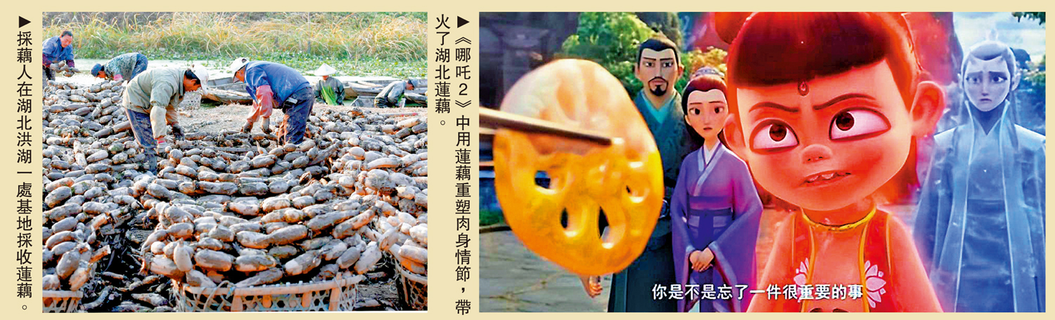 中國最大的蓮藕生產地位於湖北,全省種植面積達130萬畝,年產量320萬噸,種植面積和產量穩居全國第一。蓮藕藉《哪吒2》出圈並為其帶來顯著的銷量增長,當地藕商期待「吒兒」能讓排骨藕湯、炸藕圓等為全球認識,繼續帶火藕產銷售。\大公報記者 張帥