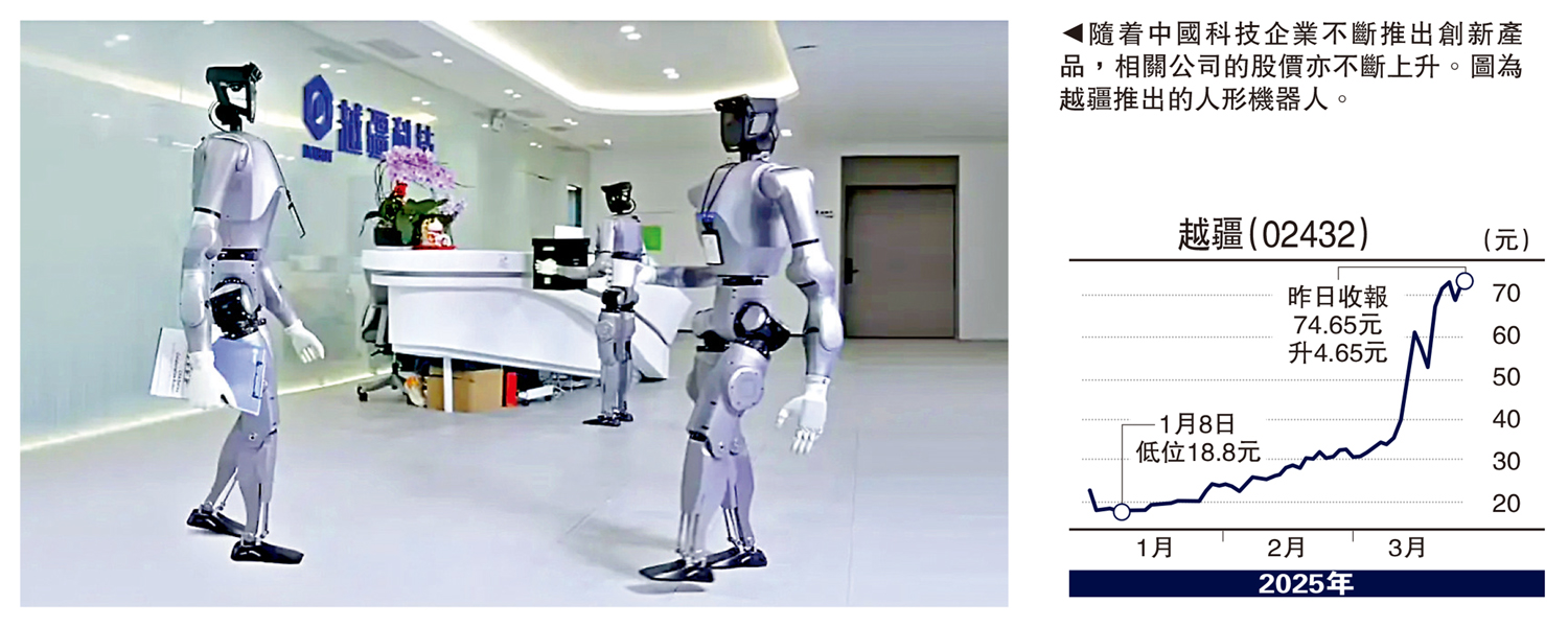 今年首兩個月,內地高技術製造業增加值同比增長9.1%,比去年全年提速0.2個百分點。其中,自今年年初開始,國產人工智能(AI)大模型異軍突起,而且人工智能技術突破與應用場景大增,令內地不斷有創新產品跑出,令中國股票投資價值全面提升,引發資金流向大逆轉,形成港股升、美股跌的市況。