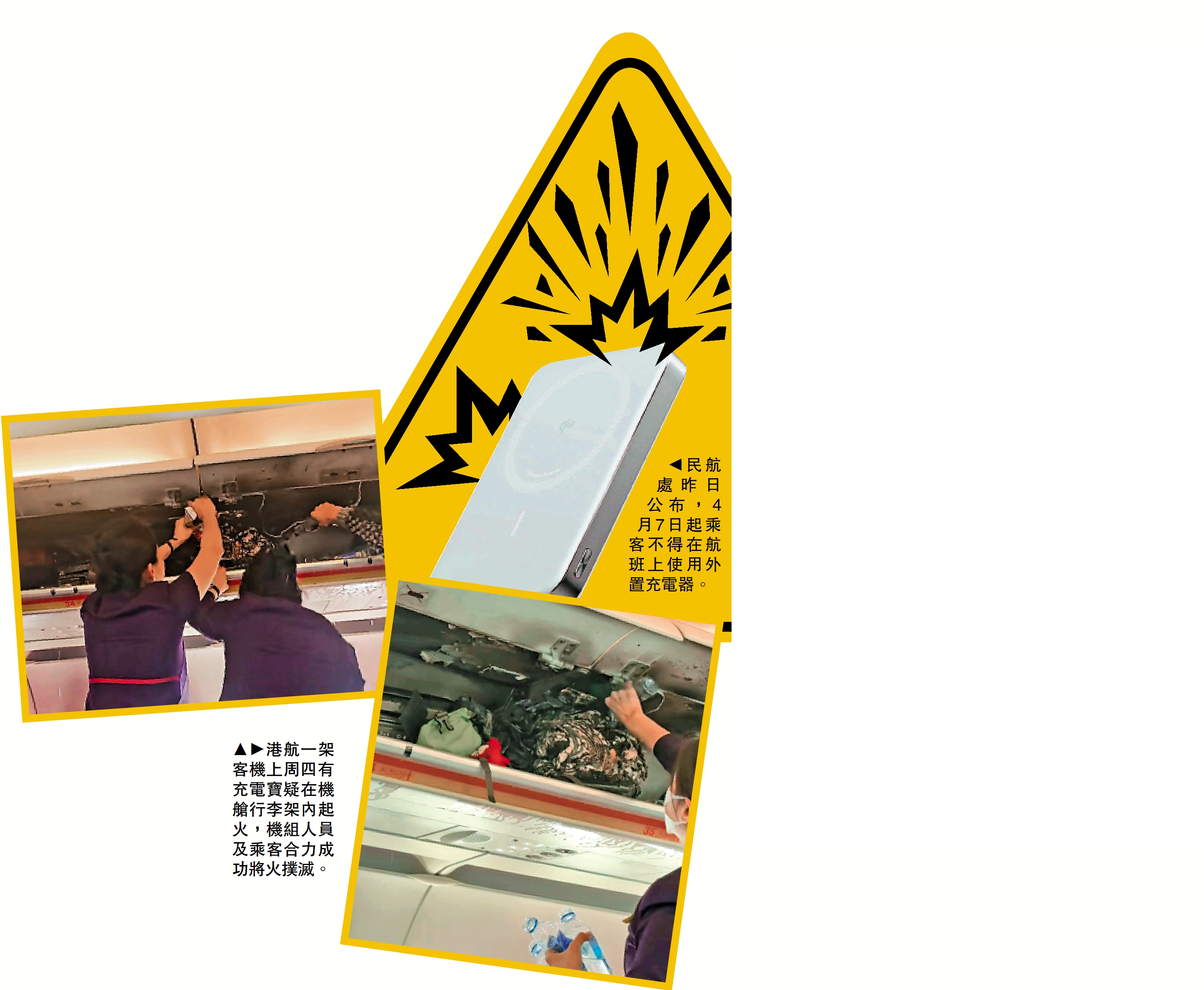 香港航空一架由杭州飛往香港的客機,於上周四(20日)下午在飛行途中懷疑有俗稱「尿袋」、充電寶的外置充電器,在機艙行李架自燃起火,幸機組人員及乘客合力成功將火撲滅,最終客機緊急改道並安全降落福州機場。就近期發生多宗類似的安全事故,民航處昨日(24日)宣布更新相關規管,由4月7日起,乘客不得在航班上使用外置充電器,亦不得把外置充電器放置於行李架上。\大公報記者 葉浩源