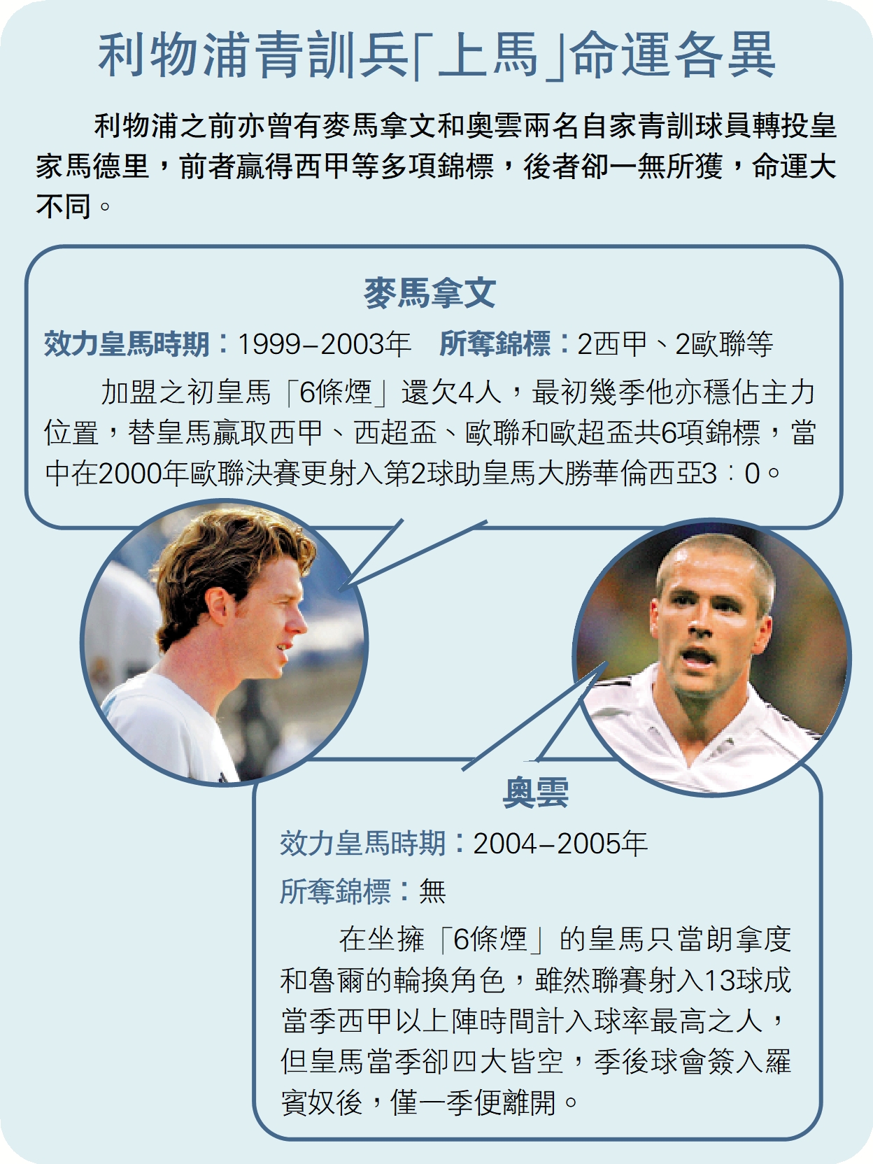 利物浦之前亦曾有麥馬拿文和奧雲兩名自家青訓球員轉投皇家馬德里,前者贏得西甲等多項錦標,後者卻一無所獲,命運大不同。